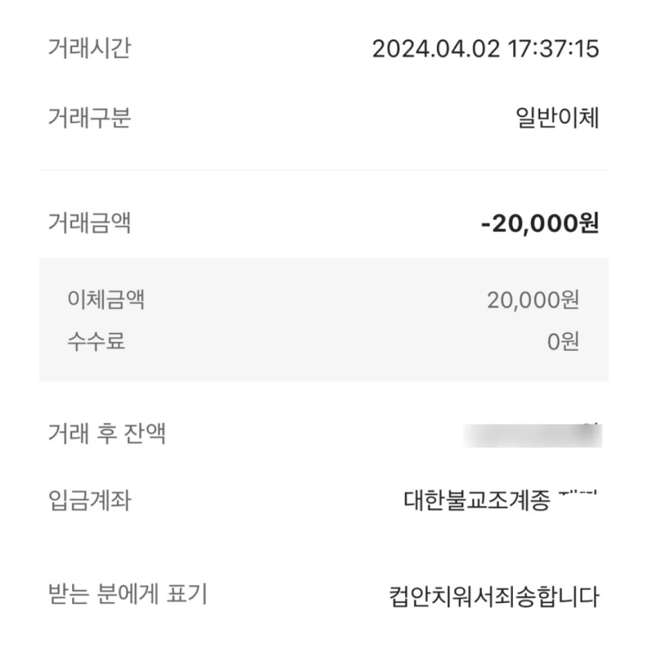 찝찝함을 떨칠 수 없던 저는 자본주의의 망령답게 빵값과 함께 사과의 메시지를 은행 계좌 거래 내역에 적어 보냈습니다.