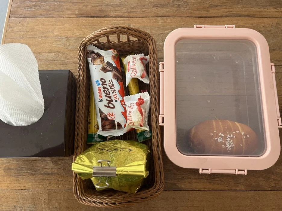 휴게실 테이블 위에 소금빵 두 개가 락앤락 통 안에 가지런히 담겨 있었습니다. 내면의 절반은 식욕으로 이뤄진 저는 조금 주저하며 그중 한 개를 훔쳐먹었습니다.