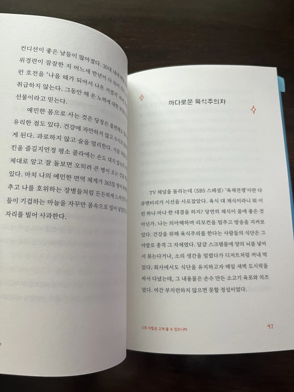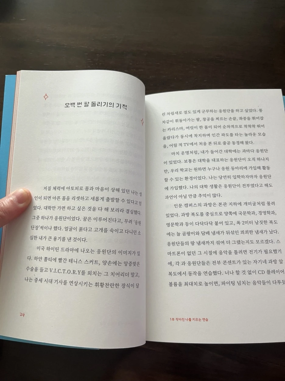 그리고 작가님은 제가 아는 것보다 훨씬 더, 흥미로운 사람이었습니다. 아토피로 붉어진 얼굴 때문에 위축된 마음을 지니고 있으면서도 대학에서는 응원단 활동을 하고, 졸업 후엔 방송작가 일을 하고, 방송작가 일을 하는 와중엔 등산 동호회에 가입해 새벽 6시부터 산행을 합니다.