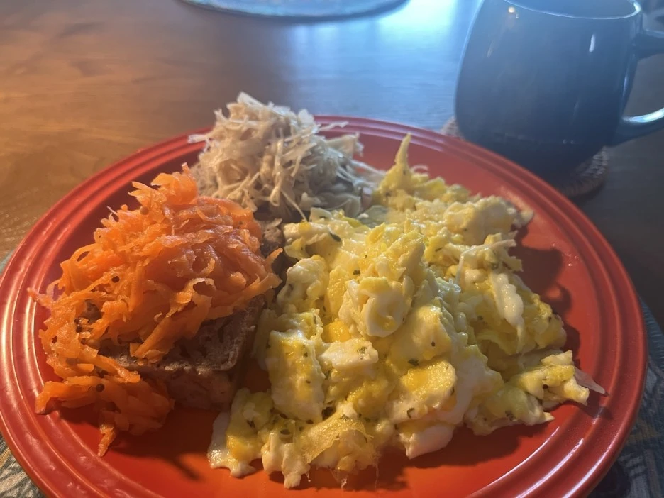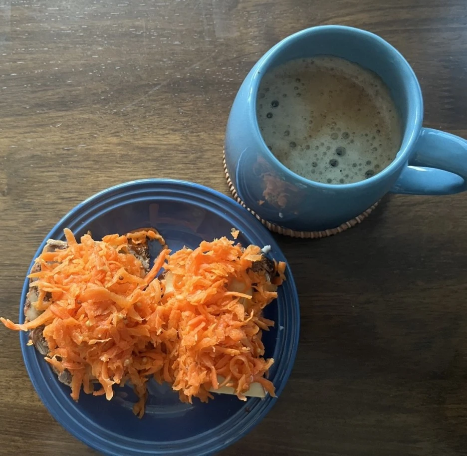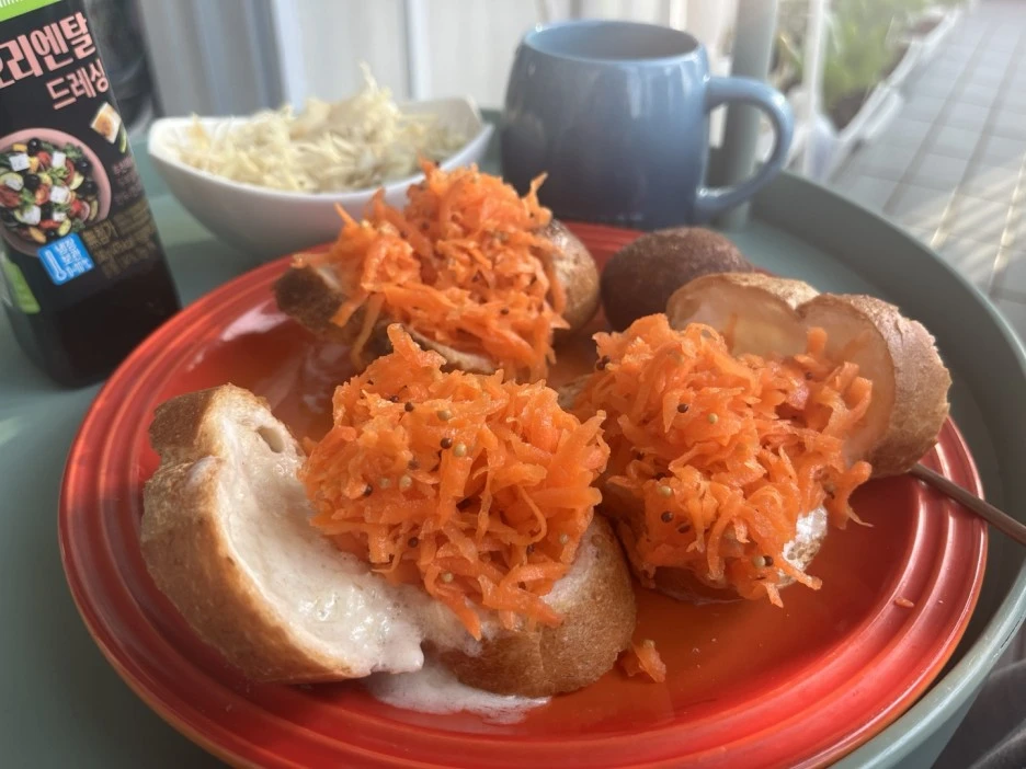 이것은 요즘 당근과 양배추와 호박에 미쳐있는 저의 아침 식단을 찍은 건데, 책을 읽으면 여러분도 자신이 먹는 것을 한번 점검하고 싶어질 겁니다.