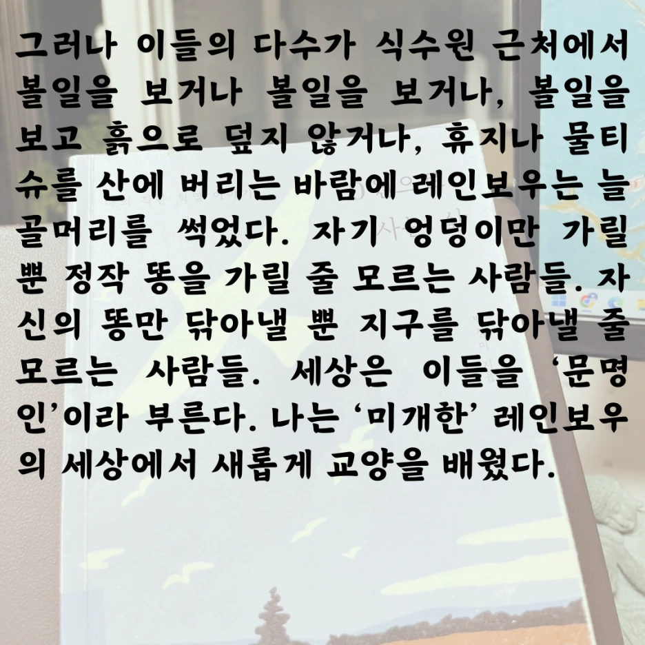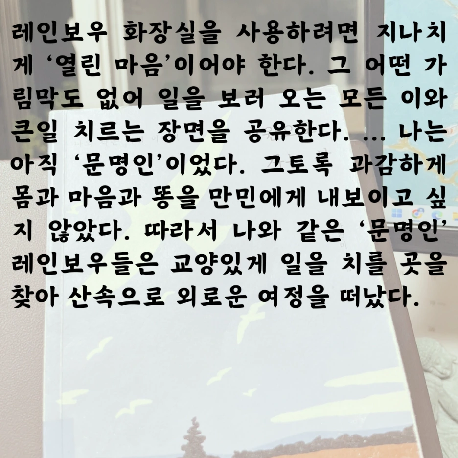 이런 생각들, 즉 내가 환경을 위해 견딜 수 있는 한계선은 어디쯤이고 그 생활을 위해 필요한 돈은 어느 정도인지 등등에 관해 구체적으로 상상할 수 있어 읽는 내내 무척 즐거웠다.