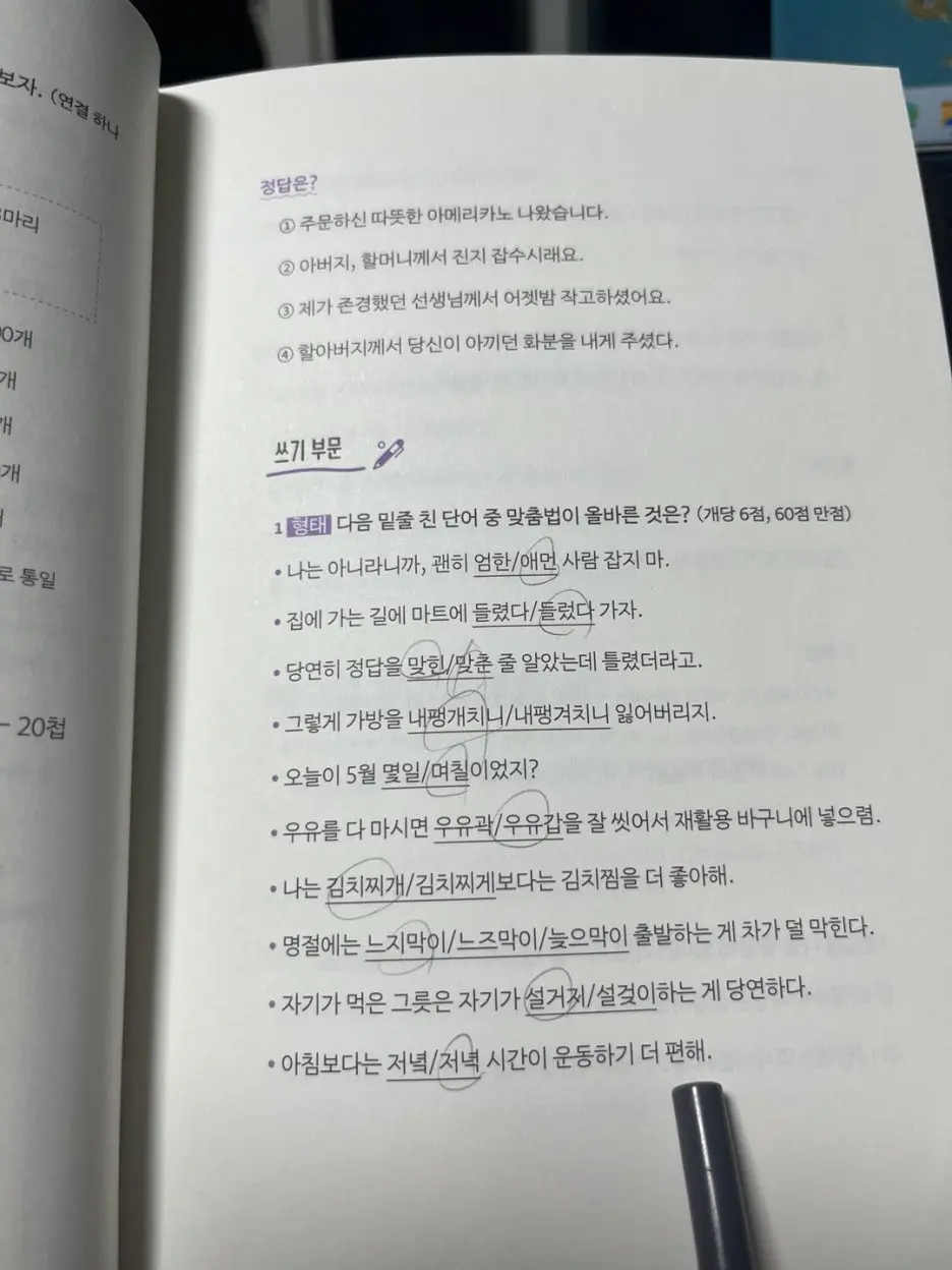 그러나 뒤에 있는 외래어 테스트는 왕창 틀렸습니다. 부탄가스도 아니고 돈가스라니…. 그렇다면 쉬림프와 슈림프 중엔 뭐가 맞는 말일까요? 정답은 책에서 확인하는 것으로!