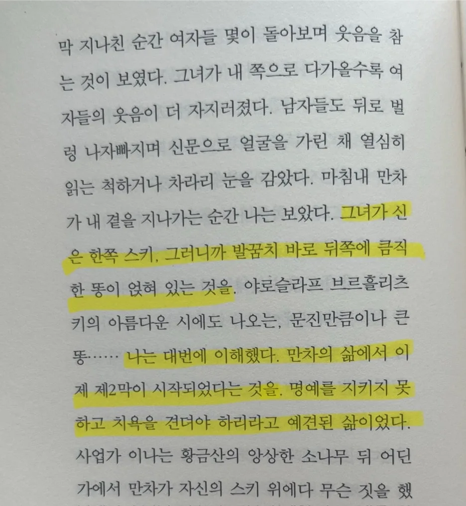 “나는 대번에 이해했다. [만차]의 삶에서 이제 제2막이 시작되었다는 것을. 명예를 지키지 못하고 치욕을 견뎌야 하리라고 예견된 삶이었다”