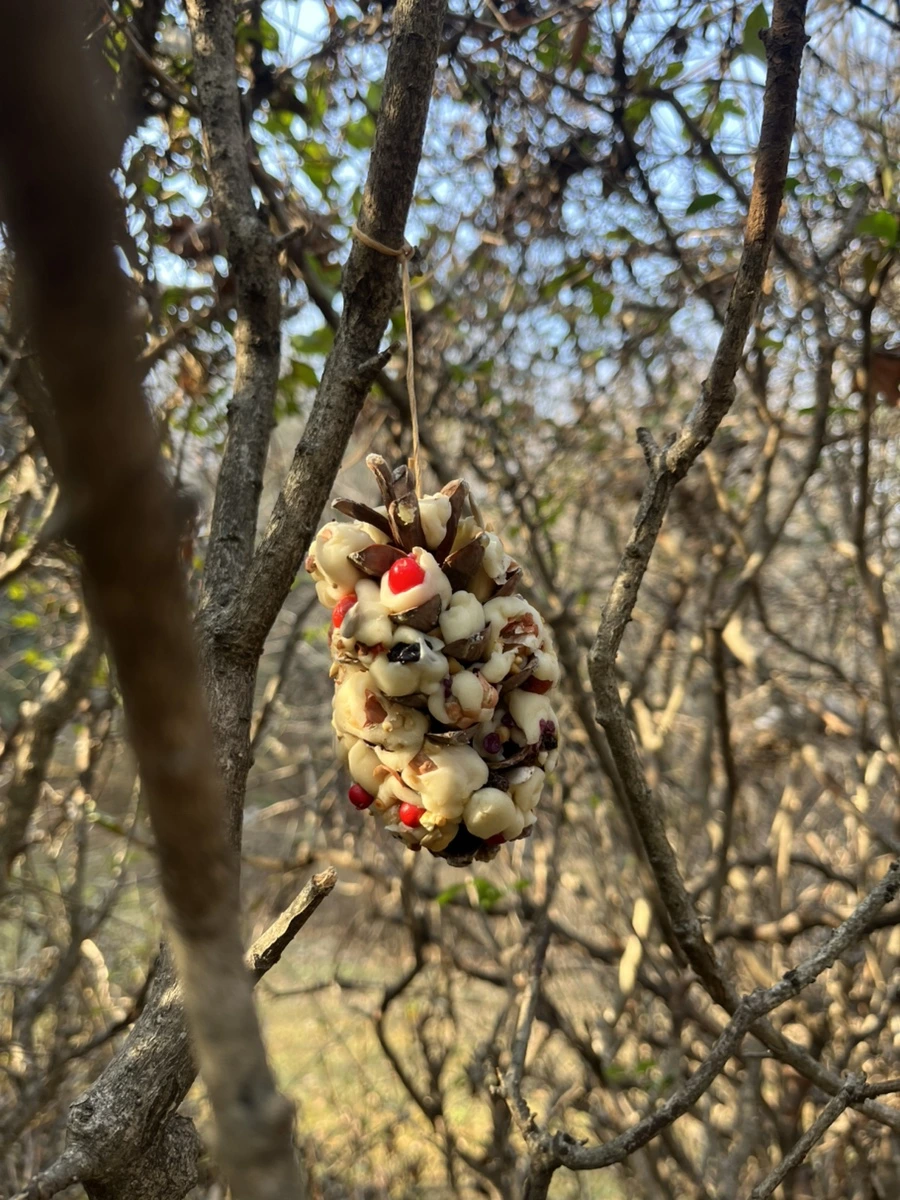 밀가루 반죽에 견과와 열매를 넣어 솔방울에 덕지덕지 붙이면 완성이다.