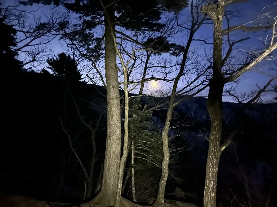 또 새벽에 출발하면 놀랍도록 까만 밤과 해처럼 밝은 달을 볼 수 있습니다. 사진 속 밝은 것은 해가 아니라 달입니다. 아이폰은 어둠을 싫어해 늘 실재보다 밝게 나오는데, 실제 새벽 풍경은 영상처럼 까맣습니다. 까만 산길을 달빛을 받으며 홀로 걷는 기분이 정말 근사합니다.