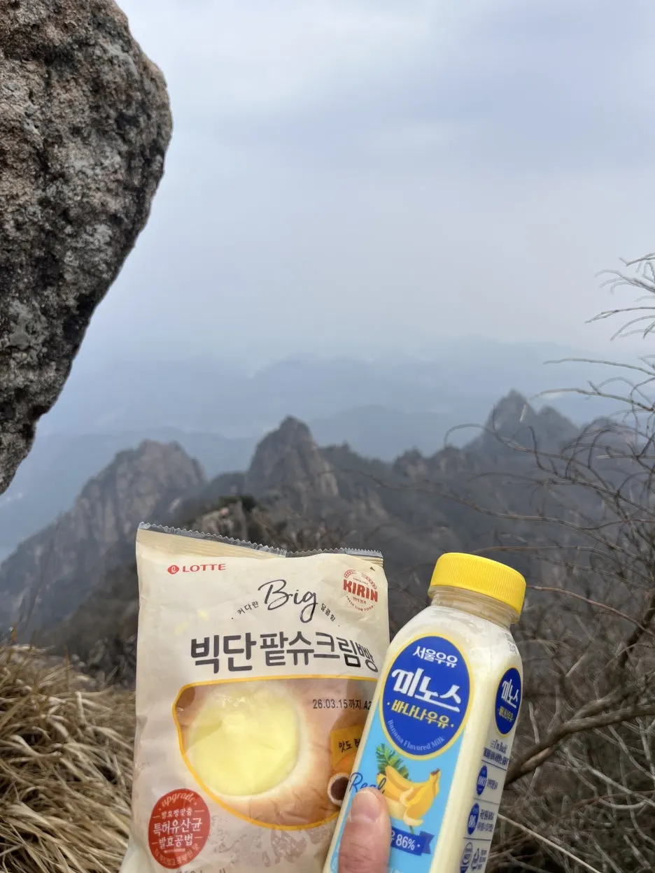 이번에도 정상에서 자리 깔고 앉아 느리게 빵과 우유를 처묵처묵하며 산마루를 보는데, 얼른 먹고 내려가라고, 호랑이가 물어간다고 하셨습니다. 마흔 넘은 여자한테 호랑이로 겁을 주다니.. 참고로 산에서 만난 사람들은 저를 굉장히 어리게 봅니다. 여러모로 등산을 권장하는 이유입니다.