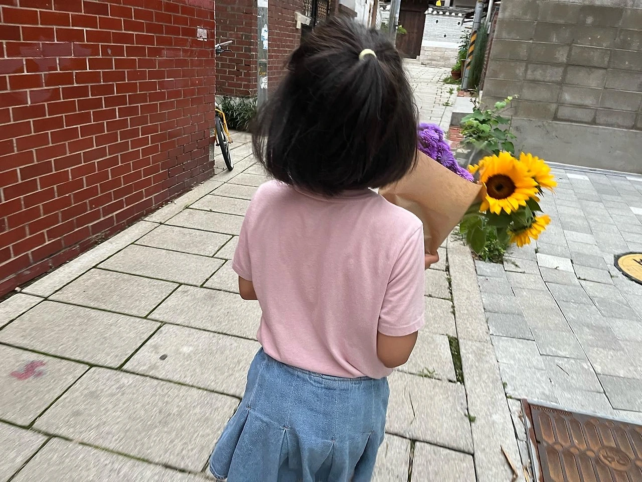 쑥스러움이 많은 첫째 아이와, 쑥스러움이라고는 찾아볼 수 없는 둘째가 마음을 합쳐, 앞 집에 가져다 드릴 꽃을 동네 꽃 트럭에서 샀다. 앞 집 아저씨가 옥상에 올라오실 때마다 푸른 계통의 셔츠를 입고 계셨다면서, 파란색을 좋아하시는 게 틀림없다는 귀여운 추리 끝에 두 녀석은 푸른 계열의 꽃을 골랐다. 해바라기는 이제 곧 시작될 장마철에, 집 안에서라도 이 꽃이 해님 역할을 했으면 하는 바람으로 내가 골랐다.