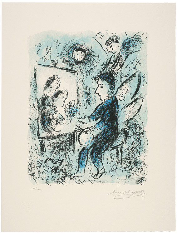 그림을 그리는 자신의 등 뒤엔 날개가 달려 있고 그의 머리 위 천사의 모습이 샤갈의 에칭 작품 속 성서 인물들의 기도하는 모습과 연상되었다. 굳게 담은 입술, 반쯤 감긴 눈은 예술가로 살아간 자신의 인생을 회고하는 덤덤한 마음이 느껴졌다.
