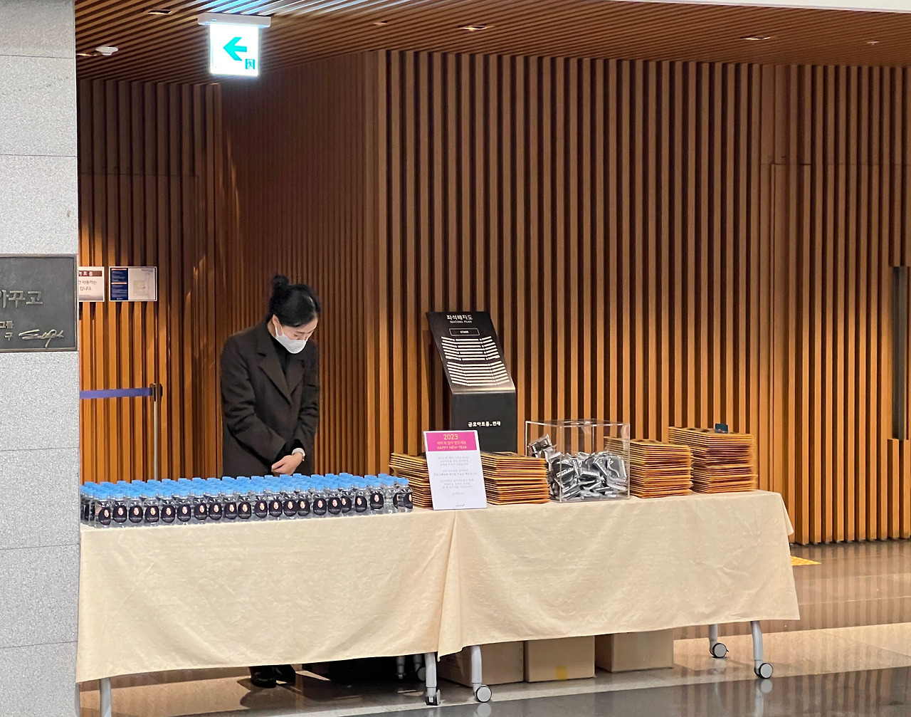 먼저는 색감 있는 홍보물과 소소한 센스가 돋보이는 생수가 눈에 띄었다. 디자인이나 스티커 작업이 사소해 보여도 시간과 노력이 드는 작업이기에 은근 감동이 있었다. 로비 벽면에는 디자인이 다른 대형 현수막 2개가 걸려 있었고, 벽면엔 인터뷰 영상이 재생되고 있어, 있어 보이는 분위기를 연출하였다.
