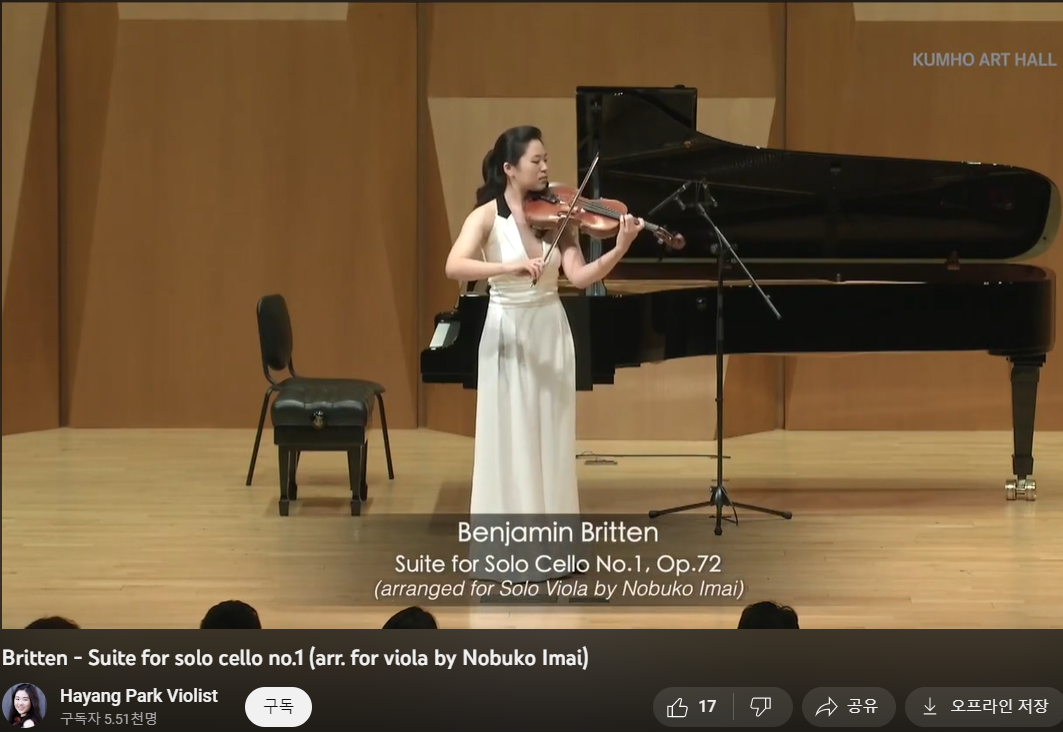 박하양 비올라 리사이틀의 첫 번째 프로그램은 그녀가 사사한 이마이 노부코가 편곡한 벤저민 브리튼의 첼로 독주를 위한 모음곡(제1번, Op 72)이었다. 비올라와 활로 낼 수 있는 모든 소리를 내는데 그것들이 하나의 음악으로 어우러졌다. 중간중간 일본풍의 멜로디와 주법이 들릴 때면 어둠이 내려앉은 저녁, 연못과 돌다리가 있는 일본식 기와집의 전경이 그려졌다.