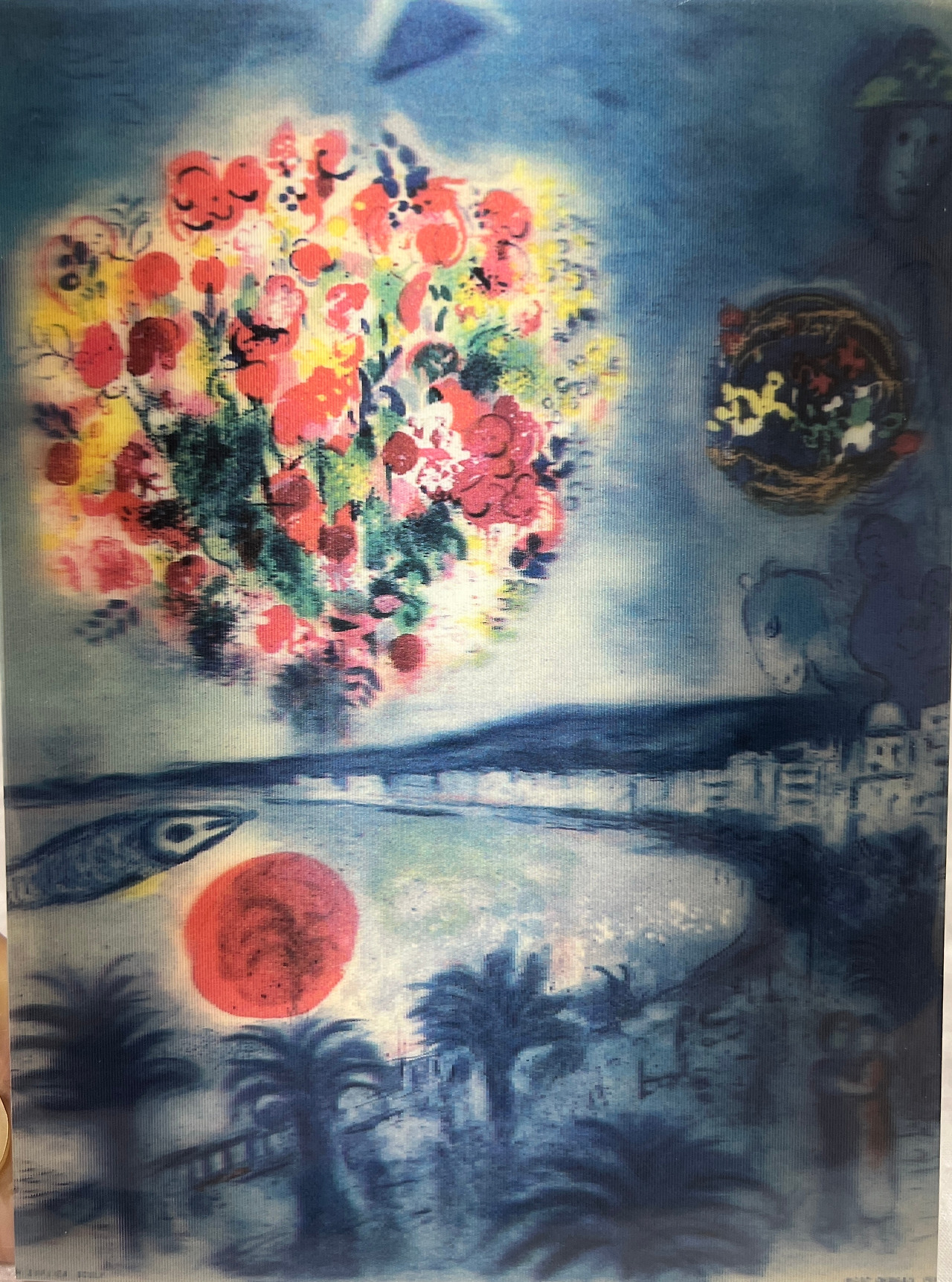 프랑스 니스로부터 도시를 홍보할 포스터를 의뢰받았을 때 샤갈은 총 열세 점의 그림을 내놓았다고 한다. <니즈와 코트 다쥬르 석양>은 석양이 지는 니스의 해변가, 주위가 어스름해지고 해가 지면 이제 달이 뜨겠지 하고 하늘을 봤더니 알록달록한 꽃풍선이 두둥실 떠있는 모습이다. 내가 이 작품을 고른 이유는 여태껏 그림을 보며 이곳에 한번 가보고 싶다는 느낌을 처음 받았기 때문이다.