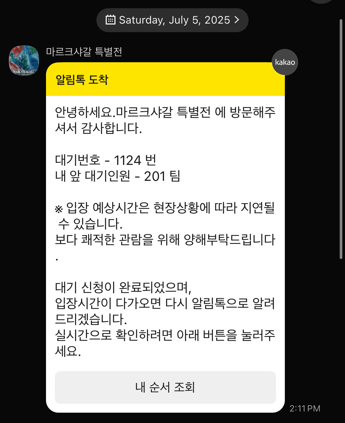 그렇게 가게 된 예술의 전당 한가람 미술관. 사람들이 샤갈 전시에 이렇게나 관심이 많을 줄 몰랐다. 대기 인원이 무려 200팀. 7월의 토요일 오후 2시 기준이니 이 시간대에 오실 분들은 대기 번호를 먼저 뽑은 후 근방에서 점심을 먹고 돌아오면 입장시간과 딱 맞겠다 싶다. (점심 먹고 대기 번호 뽑은 1인)