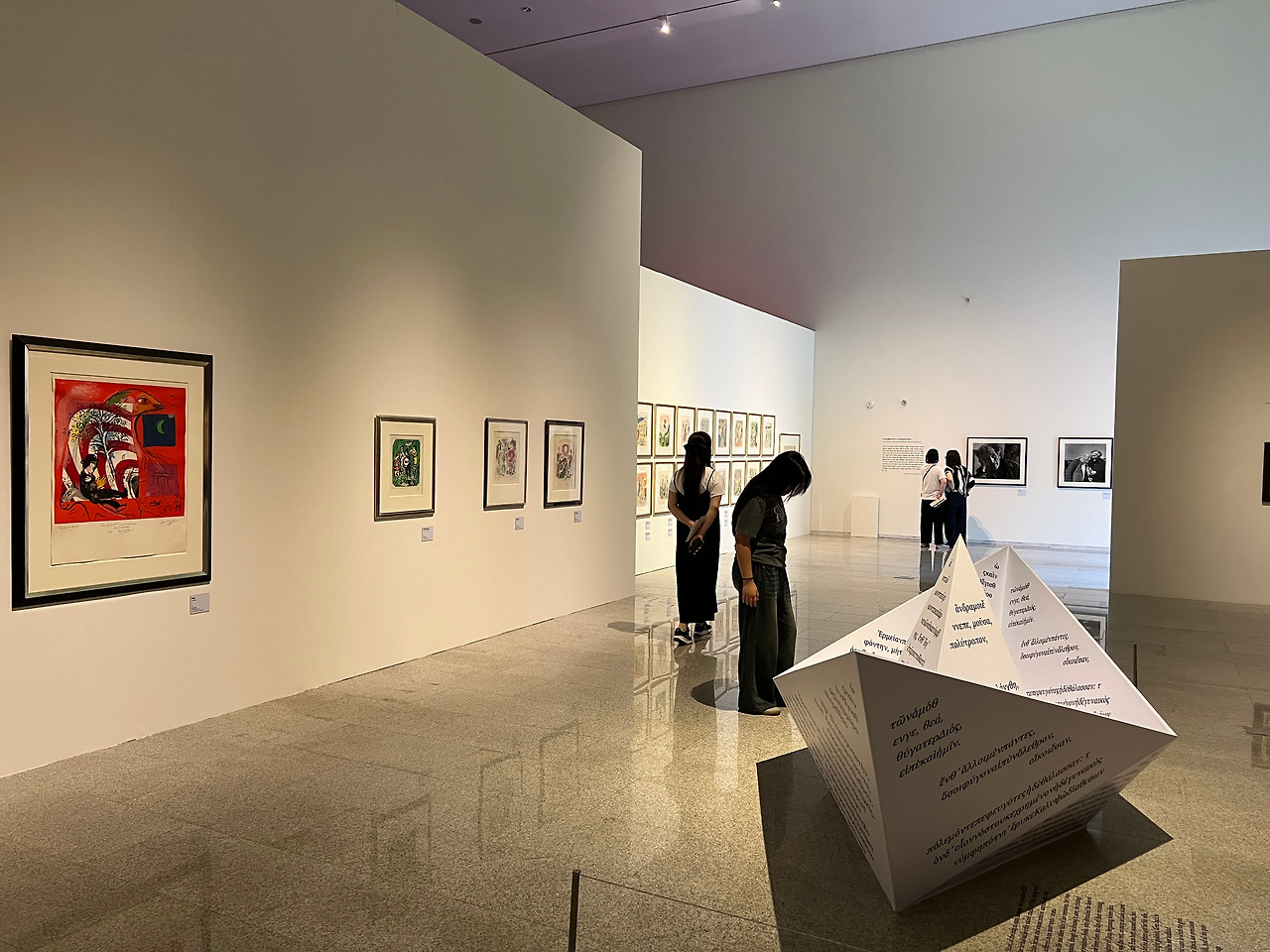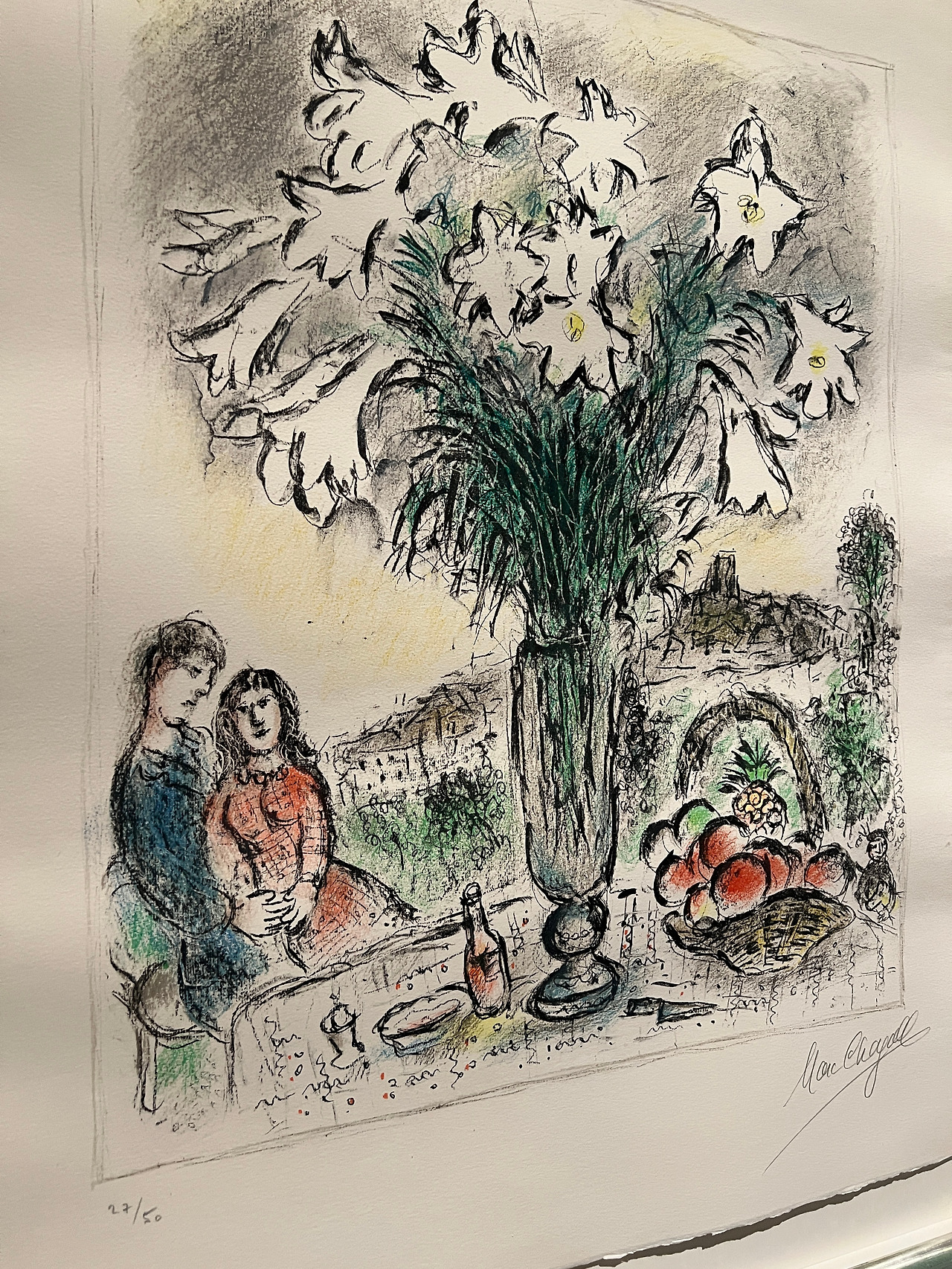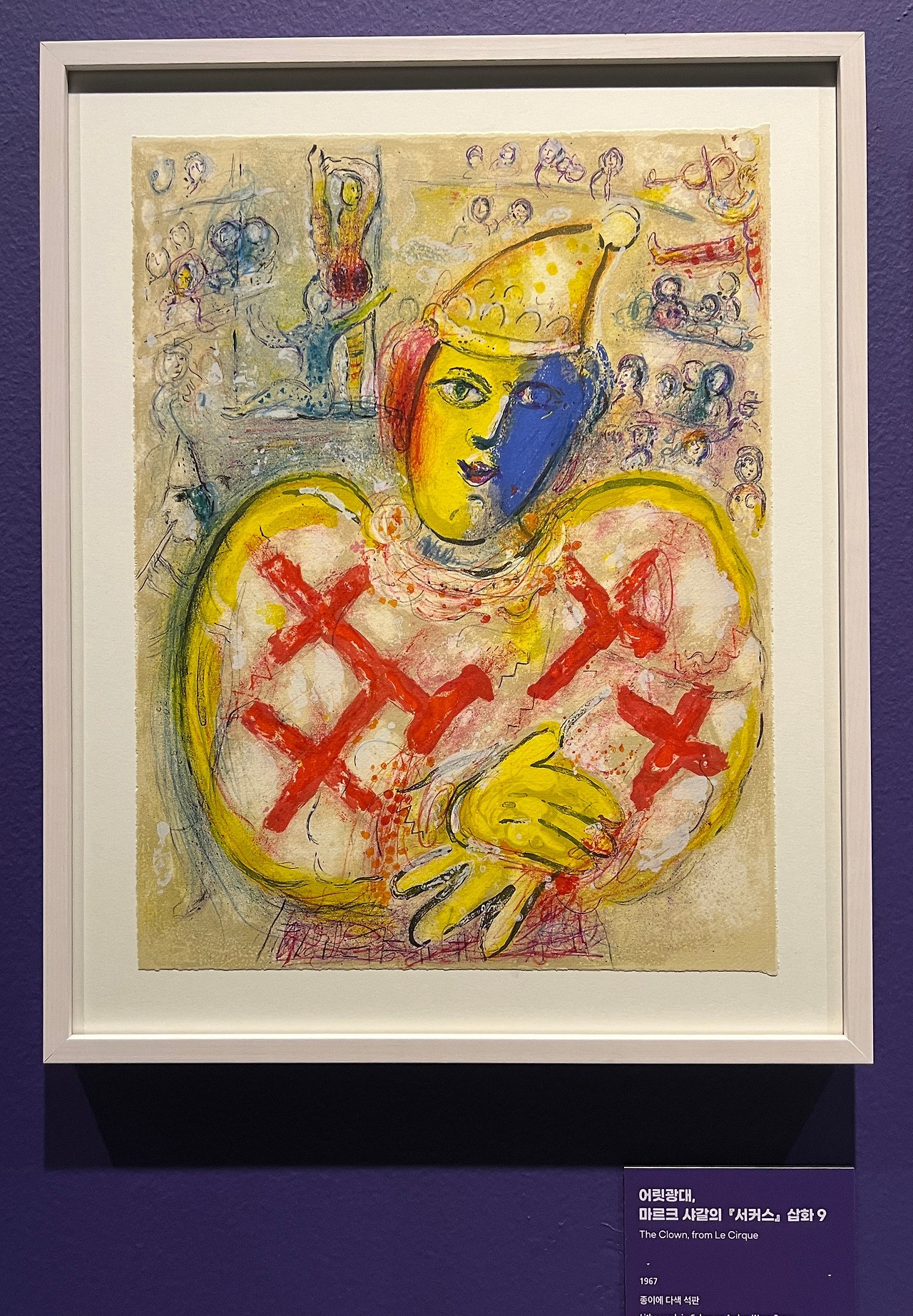 또 하나 새롭게 알게 된 사실은, 몇몇 작품 하단에 숫자가 적혀 있는데 판화로 찍어낸 작품의 총 수와 해당 작품의 순번을 나타내는 것이었다. 위 그림의 경우 판화로 찍어낸 작품이 총 50점이고 그중 제주 전시에 걸린 그림이 27번째라는 뜻이다. 이와 관련하여 문득 의문이 들었던 게 샤갈은 도대체 일생 동안 총 몇 개 작품을 남겼을까였다. 일단 국내 한정으로만 생각해 봐도 서울과 제주에서 동시에 큰 규모로 기획전을 개최하니 말이다. 내 생각을 읽기라도 한 듯 도슨트가 그룹에게 질문을 던졌는데 정답은 대략 1만 점이었다. (문득 샤갈 후손들의 근황이 궁금해진다)