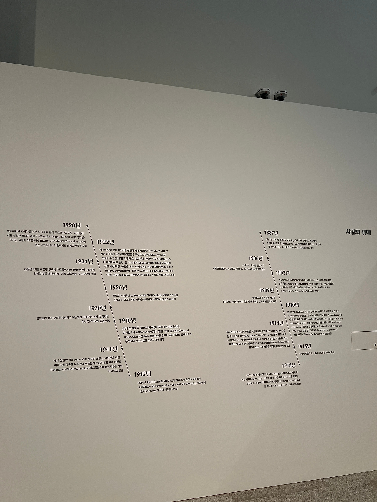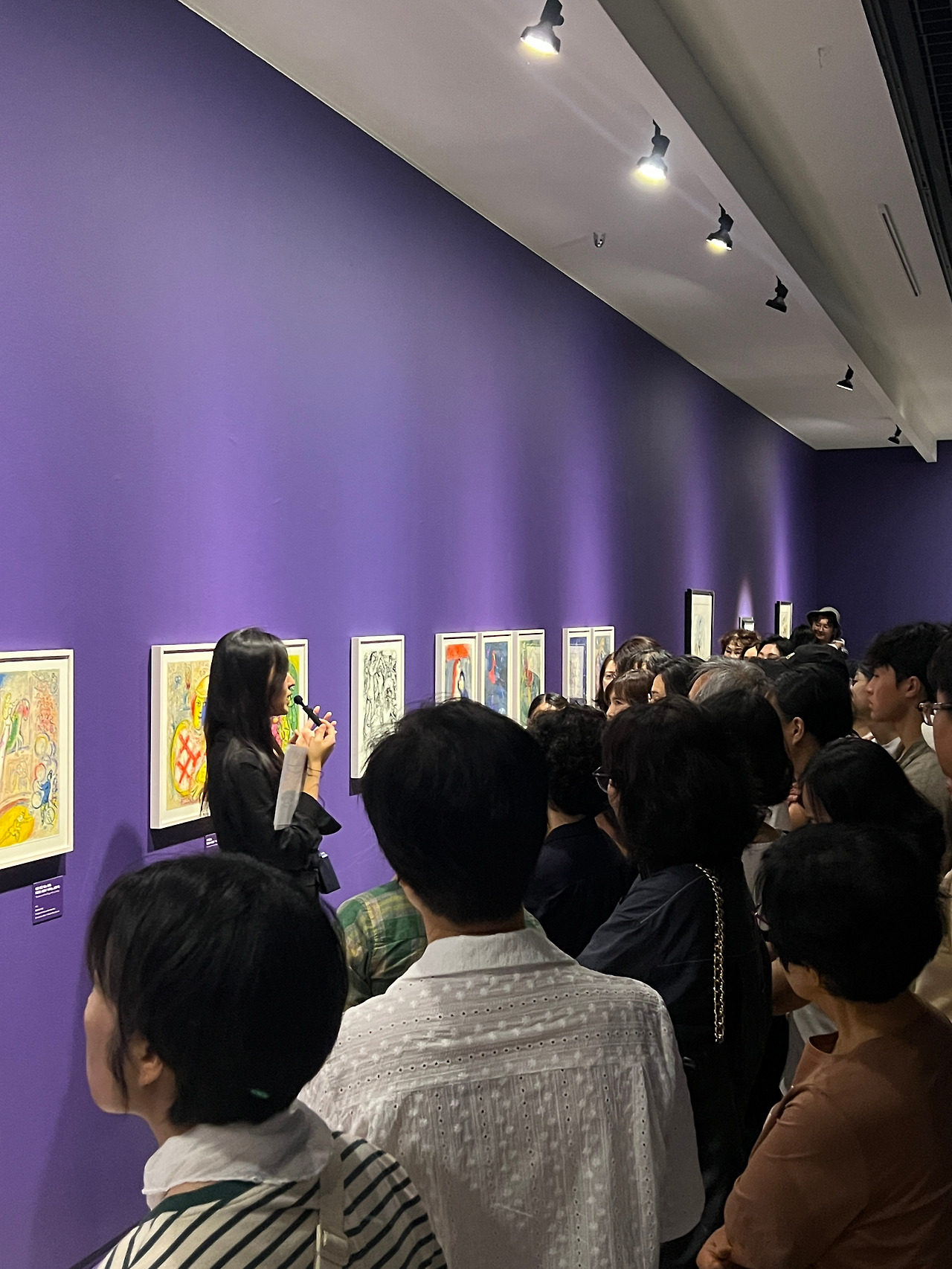박세빈 도슨트는 사갈의 생애가 정리된 연도표에서 첫 설명을 시작했다. 별도 준비한 코팅 인쇄물을 좌우 번갈아 보여주며 설명했는데 생각보다 눈에 잘 들어왔다. 샤갈 작품에서 빠질 수 없는 두 아내 벨라와 바바를 그림에서 구분하는 방법을 설명했는데 얼굴을 묘사하는 방법에서 차이가 있다고 한다. 이전까지는 생각지 못했던 부분인데 아내를 특별히 생각했던 샤갈 입장에서 충분히 그랬겠다 싶었다. (안타깝게도 나는 아직 구분을 잘 못하겠더라)