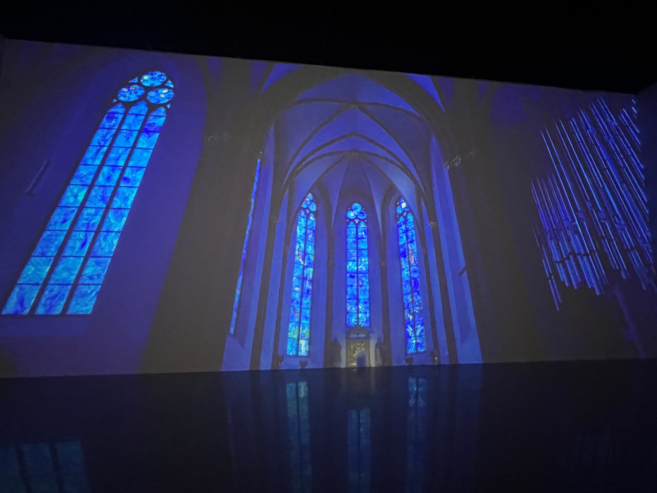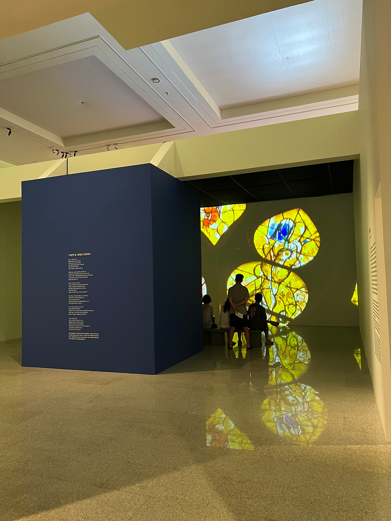 총 300여 점을 선보이는 제주 전시작 중 개인적으로 인상 깊었던 건 스테인드 글라스 작품을 영상으로 담아낸 미디어아트였다. 영국 런던의 작은 교회부터 프랑스 대성당까지 유럽 곳곳에 흩어져 있는 샤갈의 작품들을 이번 전시를 위해 직접 촬영한 영상이 별도 상영관에서 송출되고 있었다. 푸르스름함을 기초로 유리 위에 그려진 그의 작품으로도 아름다운데 빛이 투과하면서 공간이 영롱해지고 그 끝에는 샤갈의 전심이 입체적으로 다가왔다. 두 눈으로 직접 본다면 더 깊은 체험이 가능하겠다 싶어 기대되었다.