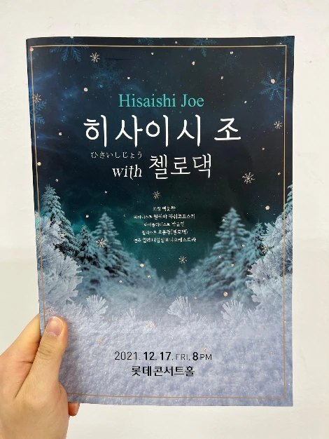 2021년 연말이 다가오고 있었다. 의미 있게 보낼 방법을 고민하다 공연 직관을 떠올렸고 첼로라는 단어가 들어간 공연명이 내 눈을 사로잡았다. 히사이시 조 with 첼로댁. 히사이시 조의 음악을 몰랐지만, 첼로댁 님에 대한 정보는 없었지만 첼로가 메인 공연이라는 사실 하나만으로 예매할 이유는 충분했다. 그렇게 롯데콘서트홀에 갈 날을 기다렸다.