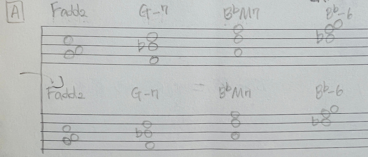 선생님이 알려준 보이싱은 내가 알고 있는 세븐 코드음과는 다른 소리를 내더라. 흥미로웠다. 이미 알고 있다고 생각한 지점에서 새로운 것을 발견을 기분이란! 이 낯선 사운드가 익숙한 날이 올 때까지 찬찬히 연습해 보련다.