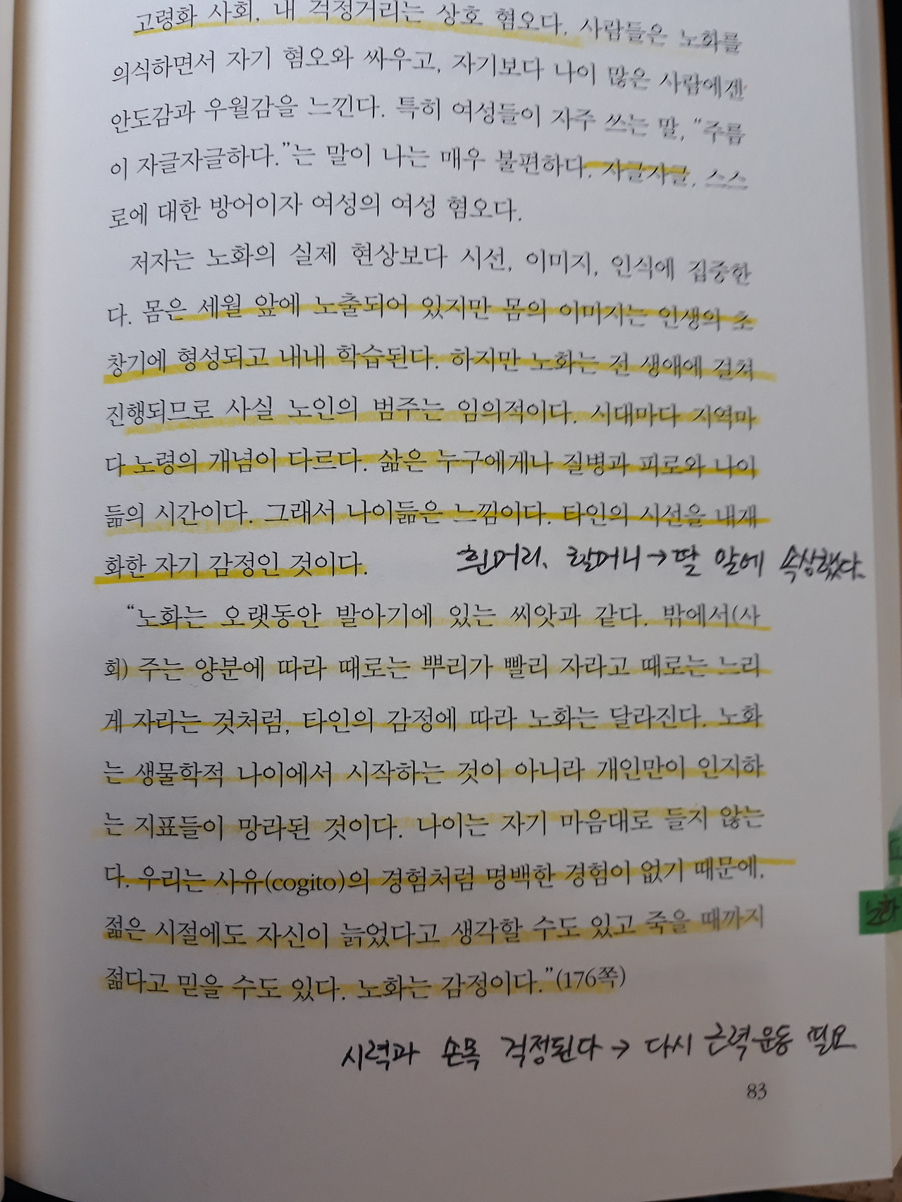 시대마다 지역마다 노령의 개념이 다르다. 삶은 누구에게나 질병과 피로와 나이 듦의 시간이다. 그래서 나이듦은 느낌이다. 타인의 시선을 내재화한 자기 감정인 것이다.(p.83) 정희진 <나를 알기 위해서 쓴다>