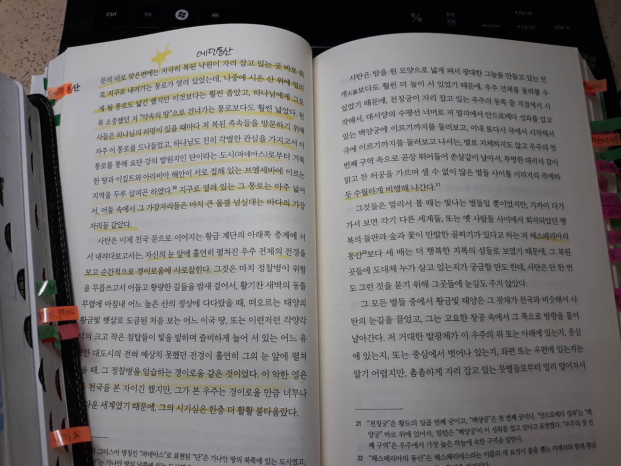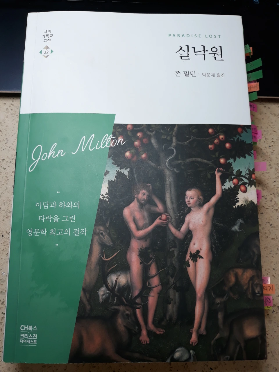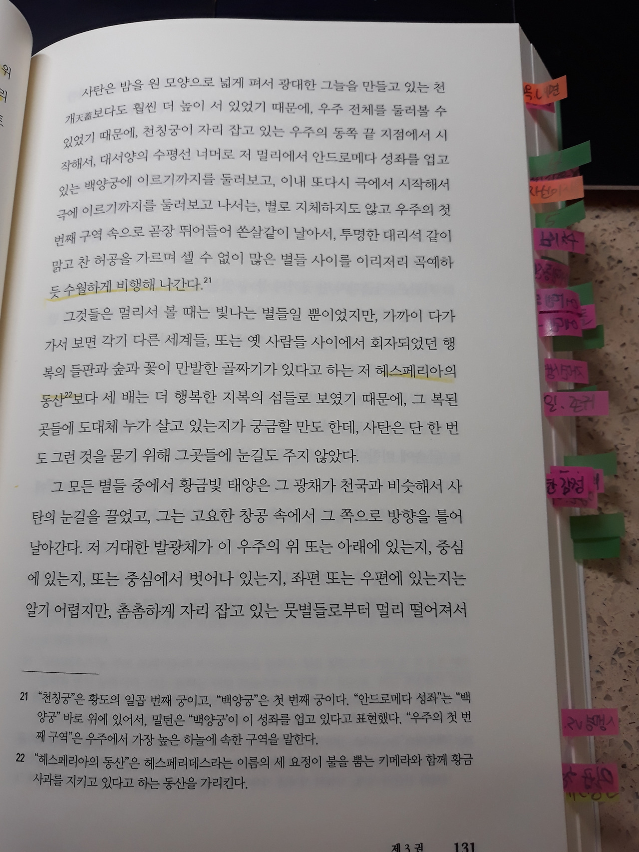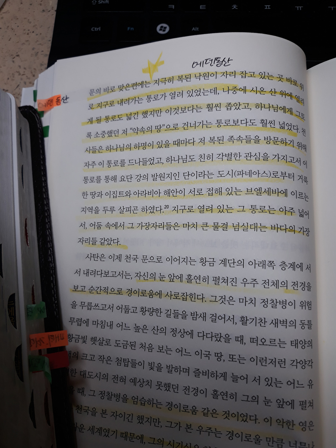 그 문의 바로 맞은편에는 지극히 복된 낙원이 자리 잡고 있는 곳 바로 위로 지구로 내려가는 통로가 열려 있었는데, 나중에 시온 산 위에 열리게 될 통로도 넓긴 했지만 이것보다는 훨씬 좁았고, 하나님에게 그토록 소중했던 저 "약속의 땅"으로 건너가는 통로보다도 훨씬 넓었다. (...) 지구로 열려 있는 그 통로는 아주 넓어서, 어둠 속에서 그 가장자리들은 마치 큰 물결 넘실대는 바다의 가장자리들 같았다. (p.130), 존 밀턴, <실낙원>