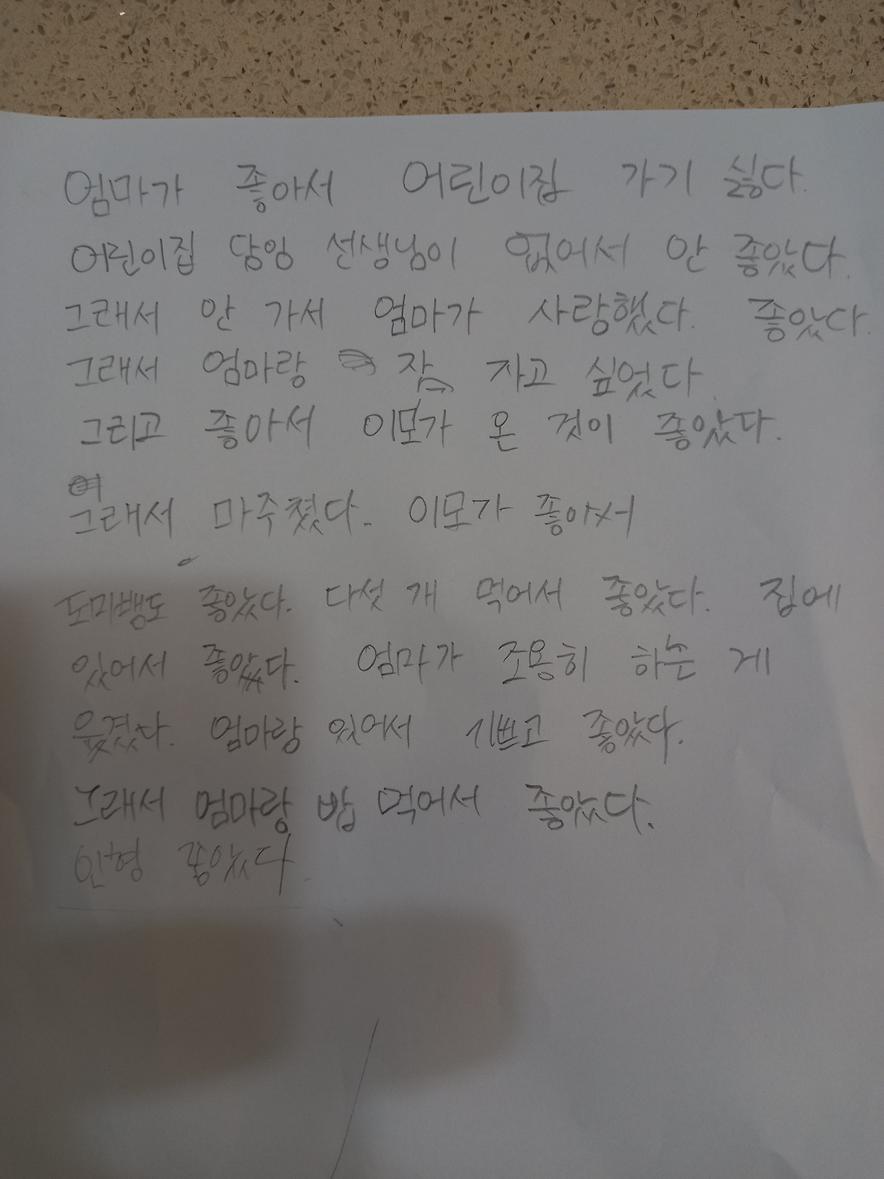 어린이집 담임선생님이 어제 급 휴가를 가셨다. 아이는 선생님이 안 오신다는 이야기를 듣자마자 펑펑 울며 강력히 등원 거부를 했다. 그렇게 네 번이나 우는 아이를 차마 보낼 수 없었다. 담임 선생님은 어린이집에서 제 일의 애착관계가 형성된 제 2의 엄마같은 분 아닌가. 그래서 어제 데리고 있었다. 아이가 말하는 대로 종이에 적어주라고 해서 받아 적었다.