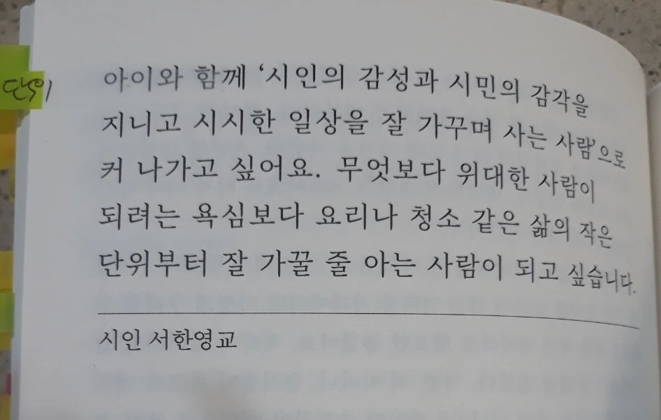 아이와 함께 '시인의 감성과 시민의 감각을 지니고 시시한 일상을 잘 가꾸며 사는 사람'으로 커 나가고 싶어요. 무엇보다 위대한 사람이 되려는 욕심보다 요리나 청소 같은 삶의 작은 단위부터 잘 가꿀 줄 아는 사람이 되고 싶습니다. (p.157) -시인 서한영교의 말, <태도의 말들> 중-