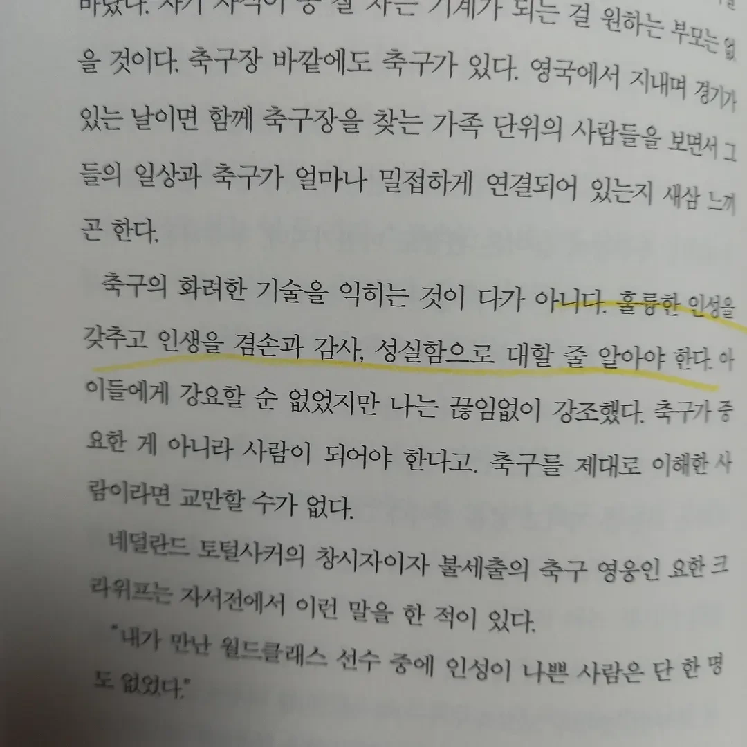 "축구의 화려한 기술을 익히는 것이 다가 아니다. 훌륭한 인성을 갖추고 인생을 겸손과 감사, 성실함으로 대할 줄 알아야 한다. 아이들에게 강요할 순 없었지만 나는 끊임없이 강조했다. 축구가 중요한 게 아니라 사람이 되어야 한다고. 축구를 제대로 이해한 사람이라면 교만할 수가 없다." - 손웅정-