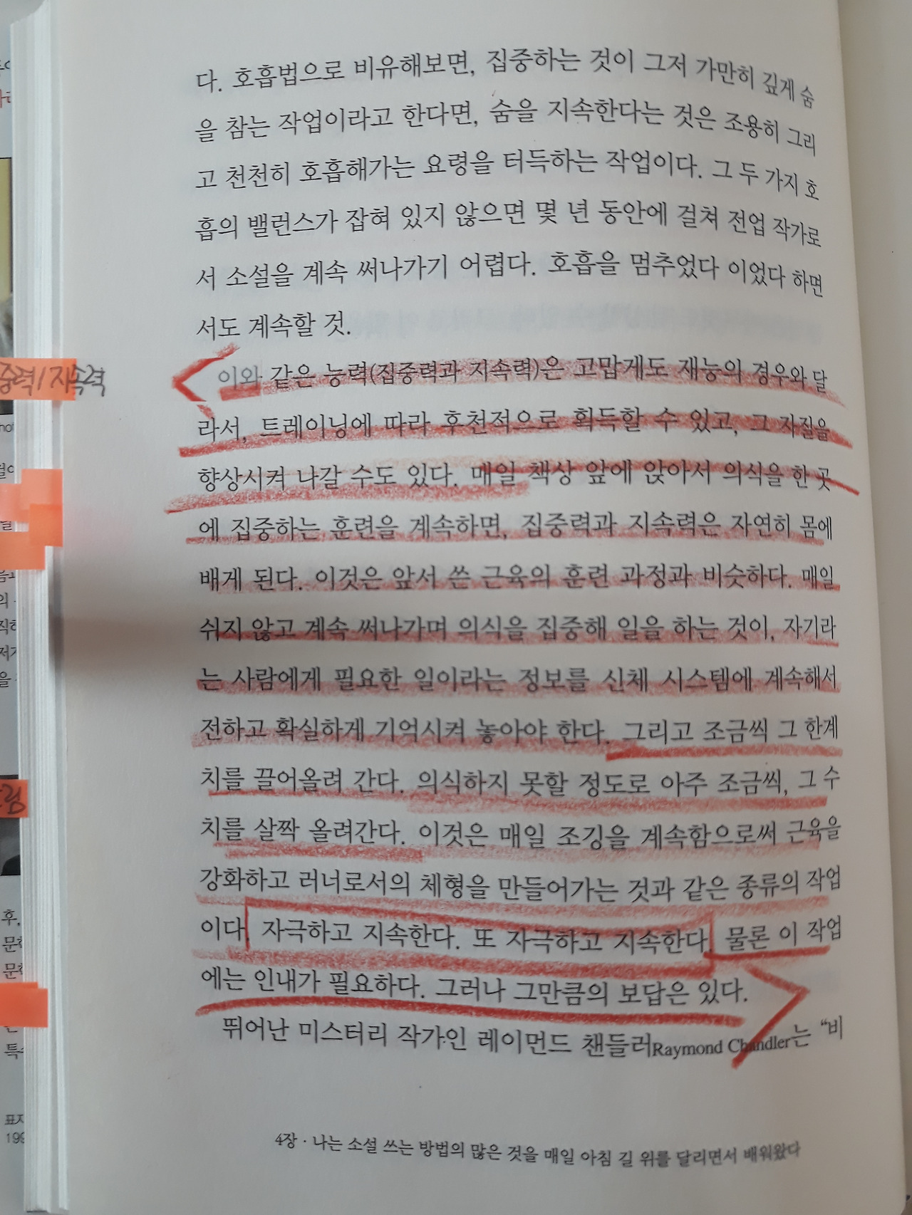 이와 같은 능력(집중력과 지속력)은 고맙게도 재능의 경우와 달라서, 트레이닝에 따라 후천적으로 획득할 수 있고, 그 자질을 향상시켜 나갈 수도 있다. 매일 책상 앞에 앉아서 의식을 한 곳에 집중하는 훈련을 계속하면, 집중력과 지속력은 자연히 몸에 배게 된다. 이것은 앞서 쓴 근육의 훈련 과정과 비슷하다. 매일 쉬지 않고 계속 써나가며 의식을 집중해 일을 하는 것이, 자기라는 사람에게 필요한 일이라는 정보를 신체 시스템에 계속해서 전하고 확실하게 기억시켜 놓아야 한다. 그리고 조금씩 그 한계치를 끌어올려 간다. 의식하지 못할 정도로 아주 조금씩, 그 수치를 살짝 올려간다. 이것은 매일 조깅을 계속함으로써 근육을 강화하고 러너로서의 체형을 만들어가는 것과 같은 종류의 작업이다. 자극하고 지속한다. 또 자극하고 지속한다. 물론 이 작업에는 인내가 필요하다. 그러나 그만큼의 보답은 있다. p.122 -무라카미 하루키의 <달리기를 말할 때 내가 하고 싶은 이야기> 중