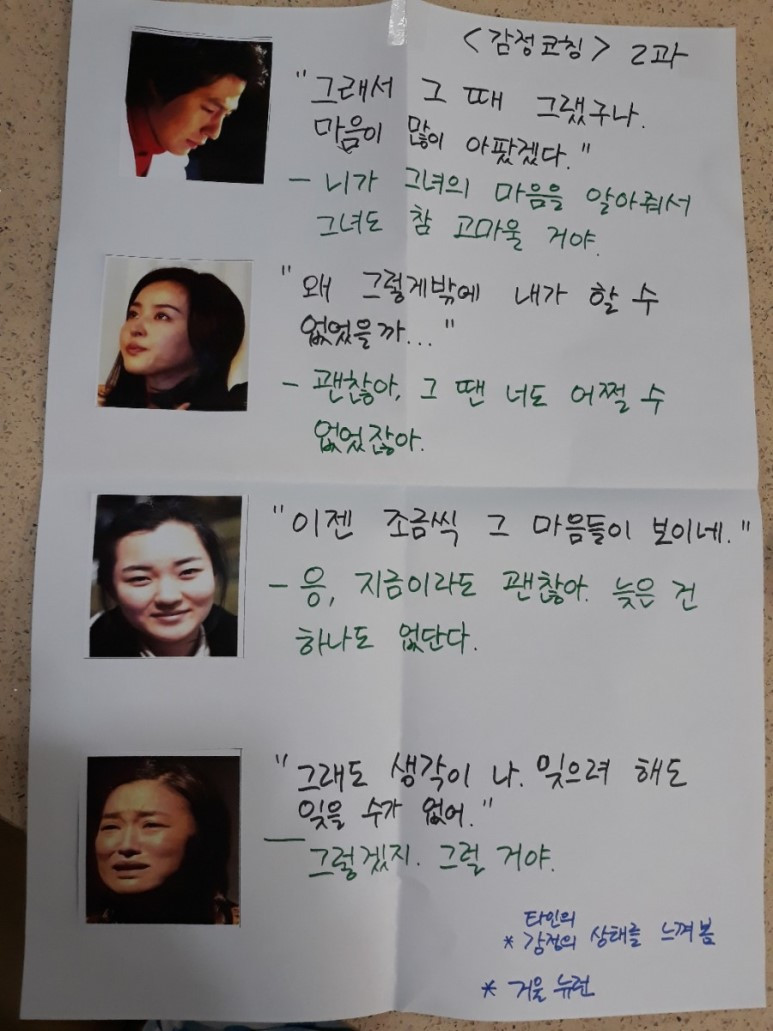 아침부터 눈물을 쏟아내고 김밥을 꾸역꾸역 먹으며 애들 네 명을 다 등교, 등원시키자 마자 '감정코칭' 수업 2차시를 들으러 댓바람으로 달려나갔다. 인간은 느끼는 게 본능인데 본능까지 강의 들으며 배우러 다녀야 하는 내가 안쓰러웠다. 슬픔, 분노, 모멸감, 기쁨, 이런 걸 배워야 안단 말인가. 그럼, 모르면 배워서라도 알아가야지.