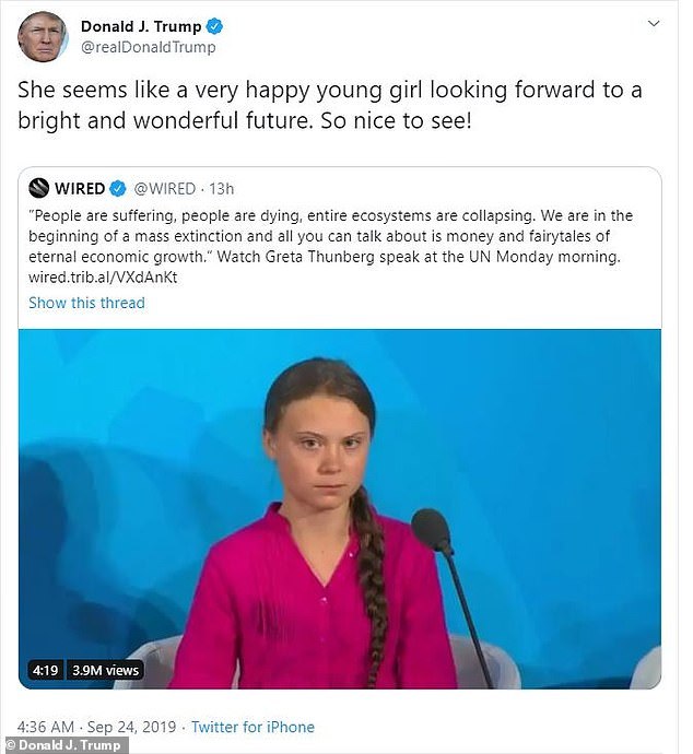 그레타의 유엔 연설후 (그레타의 연설 전에 이미 퇴장한) 트럼프는 트위터를 통해 "밝고 멋진 미래를 기대하는 행복한 어린 소녀같았다. 만나서 반갑”이라고 썼다. 그레타는 트럼프의 조롱섞인 문구 그대로 빌어와 자신의 트위터 소개글을 바꿨다. "그레타 툰베리. 밝고 멋진 미래를 기대하는 행복한 어린 소녀". 폭스 뉴스의 한 패널은 "정신적으로 아픈 스웨덴 아이"라고 말했고 폭스는 그 발언에 대해 바로 사과했다.