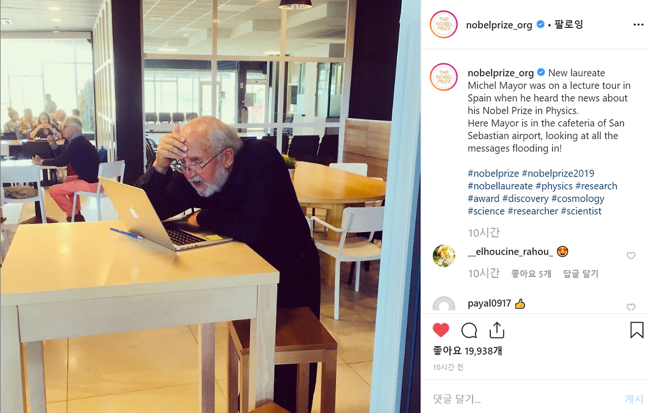 사진 속 넋이 나간 상태의 가엾은 아저씨는 2019년 노벨 물리학상 수상자인 미셸 마요르입니다. 스페인으로 강의를 하러 가는 사이 처음 연락을 받았고, 몇 시간 후 공항에서 컴퓨터를 켜자 밀려들어오는 축하 메시지를 보며 어찌할 바를 모르는 상태의 수상자의 모습입니다ㅎㅎ 겨울에 산타 알바 하셔도 될듯.