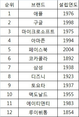 2019 포브스가 선정한 최고의 브랜드 1위에서 12위까지의 평균 나이는 67세다. 2004년 창업한 페이스북이 15살로 가장 젊고, 1854년 설립한 루이뷔통이 165세로 최고령이다. 애플이나 아마존 같은 IT와 전자제품 기업이 젊은 편이다. 상대적으로 젊다는 것이지 인터넷과 이커머스의 역사를 떠올리면 시초나 다름없다. 반면 디즈니나 코카콜라 같은 기업은 100년 가량 되었다. 10위권에 든 제조업으로는 삼성과 토요타가 각각 81년, 82년 된 기업이다.