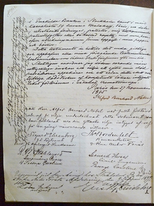 “나 알프레드 베르나르드 노벨은 심사숙고한 결과 내가 죽을 때 남기게 될 재산과 관련하여 이 문서로써 아래와 같이 유언을 천명하는 바이다.” 이렇게 시작되는 유언장에는 우선 일가친척과 사업을 함께 하는 동료 및 직원에게 분배할 재산 내역이 열거되어 있었다.