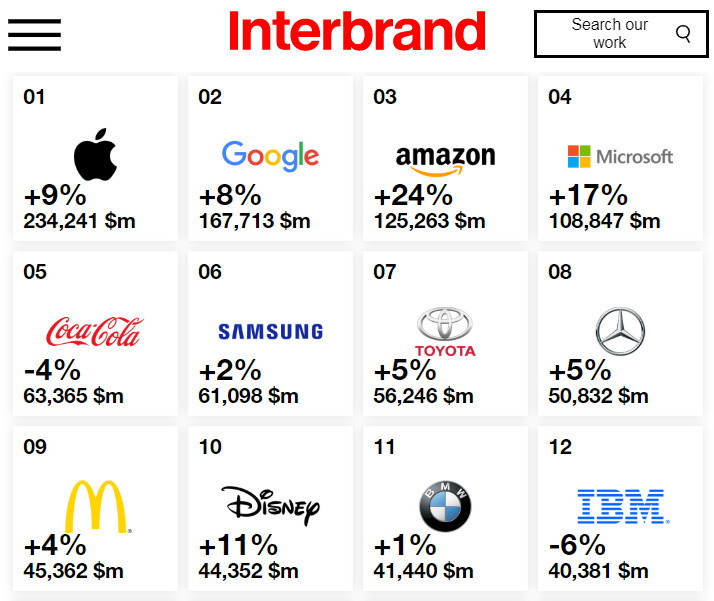 2019년 포브스가 뽑은 최고의 브랜드는 애플이다. 파이낸셜 타임스는 아마존을, 글로벌 브랜드 컨설팅 회사인 인터브랜드는 애플을 선정했다. 보유자산, 매출액, 시장점유율, 언론 노출과 같은 정량평가에 더해 브랜드에 대한 전 세계 소비자의 선호도와 반응을 담은 정성평가를 고유의 비율로 가점을 주어 선정한다. 노벨상은 기업이 아니므로 평가 대상이 아니지만 인지도와 충성도, 선호도와 언론 노출 등에 있어서는 어떤 브랜드에도 밀리지 않는다.
