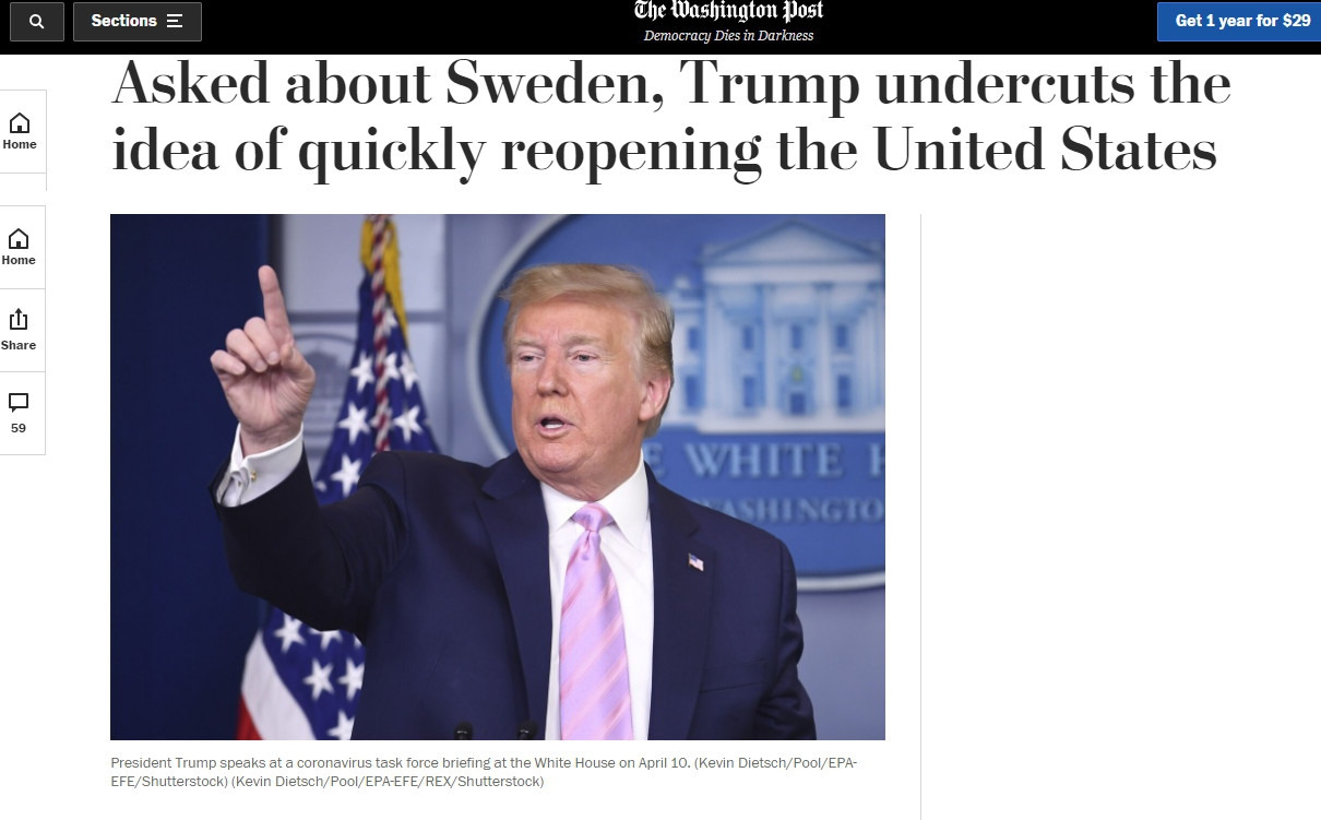 많은 분들이 스웨덴의 대응을 비판하고 있고, 지난 토요일에는 미국의 트럼프 대통령이 기자회견장에서 스웨덴처럼 대응하면 훨씬 많은 사람이 목숨을 잃을 것이라고 답했습니다.
