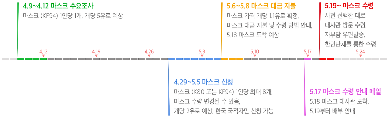 1인당 1개씩 개당 5유로 예상으로 마스크 수요조사를 한다는 메일에 재외국민까지 신경 써주는 마음은 고마웠으나 마스크 1개를 받기 위해 너무 많은 수고가 들어가는 듯하여 수요조사 참여가 상당히 망설여졌다. 그래도 혹시 몰라 수요조사에 응했다. 20일 후 대사관을 대신해 한인 단체가 마스크 구매신청을 받았다. KF80 또는 KF94 마스크를 랜덤으로 판매하는데, 개당 2유로, 최대 마스크 8개 신청이 가능하지만, 신청 수량보다 적게 판매될 수도 있다는 안내가 있었다. 신청대상이 한국 국적으로만 한정되어 아쉽긴 했지만, 초기 공지보다 수량이 넉넉해서 망설임 없이 구매신청을 했다.