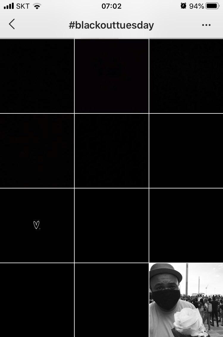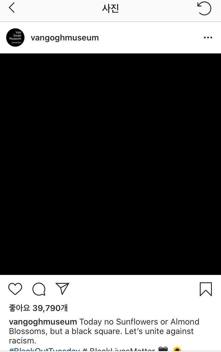 6월 1일부터였나. 아무런 글씨도 그림도 없는 까만바탕으로 된 이미지가 인스타그램 피드 곳곳에 올라왔다. 처음엔 용량이 큰 이미지라 로딩이 늦어지는 건가 싶었다. 그런데 한 두 개가 아니었다. 개인뿐 아니라 반 고흐 미술관이나 매그넘포토스 등의 기관, 몇몇 브랜드도 같은 이미지를 올렸다.