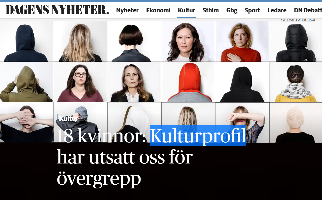 그중 스웨덴 사회를 뒤흔든 사건이 있었다. 한 여성이 6년 전 문화계 유력인사에게 강간을 당했다고 고백한 것이다. 해당 증언은 곧바로 당시 피해사실을 들었거나 비슷한 경험을 한 여러 사람에 의해 확인되었다. 뒤이어 무려 18명이 같은 인물에게 성폭력을 당했다고 유력 일간지 다겐스 뉘헤테르를 통해 고백했다. 신문은 피해자의 고백이 믿을 만한지 다각도로 확인했고 진실이라는 확신이 든 후에 기사로 내보냈다.