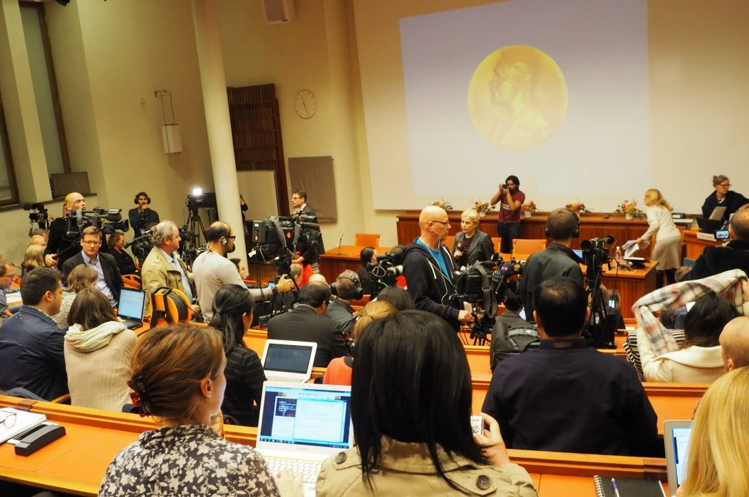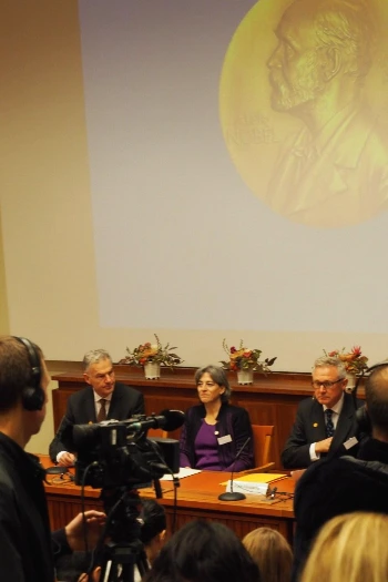 시간이 되자 금색 배지를 단 노벨 위원회 세 사람이 줄지어 나와 무대 중앙에 앉았습니다. 뒤이어 따라온 중년의 남자가 단도직입적으로 수상자를 발표하기 시작했습니다. 스웨덴어, 영어, 독일어, 프랑스어 순서로 발표를 마치자 앞서 나온 세 사람 중 하나가 수상자의 연구에 대한 소개를 담은 강의가 이어졌습니다. 이후에는 다양한 질의응답이 이어졌지요.