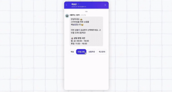 자체적인 채팅 시스템을 개발해서 쓰는 경우도 있겠지만 현재 회사에서는 '채널톡'이라는 채팅 상담 프로그램을 이용하고 있다. 채널톡에서는 챗봇을 '서포트봇'이라고 하는데, 상담원 연결 없이 고객이 자주 물어보는 질문을 자동응답으로 처리할 수 있는 기능이다.