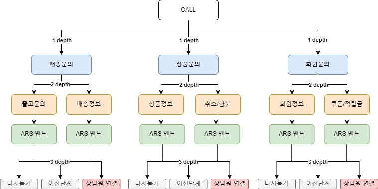 나는 IVR을 최대 3 depth로 구성했다. 2 depth에서는 각 메뉴마다 안내멘트를 넣었으며, 바로 상담원과 연결되지 않고 안내멘트를 다시 들을 건지, 이전 단계로 돌아갈 건지, 아니면 상담원과 연결할 것인지를 선택하게 했다.