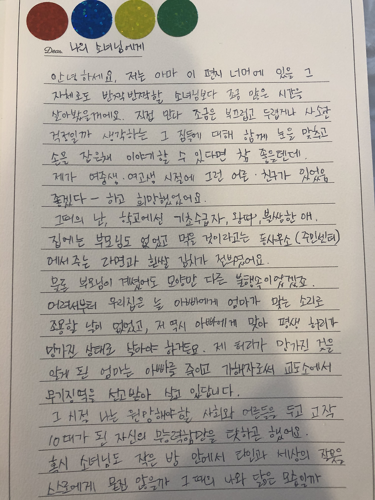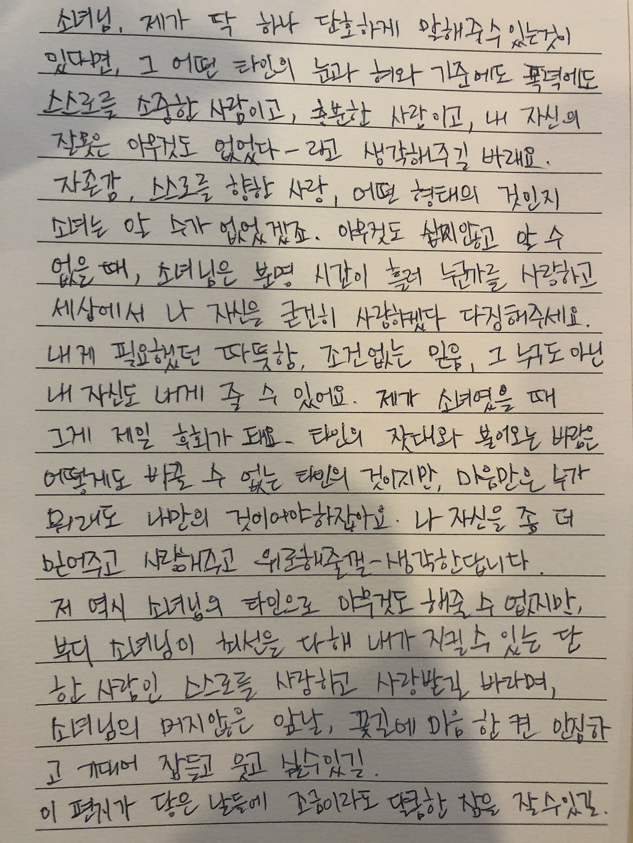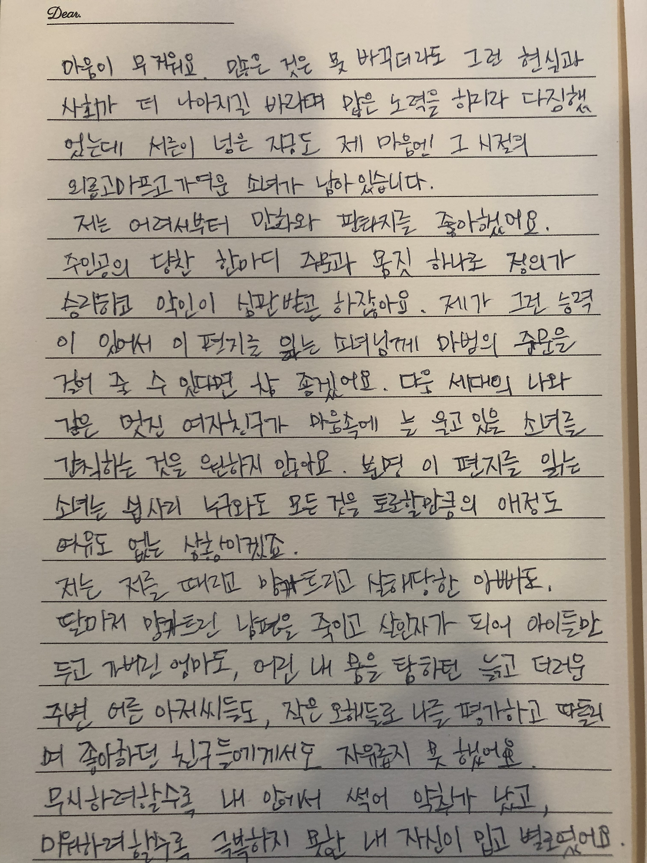 이미 어른이 되어버린 우리들 외에 비슷한 문제로 지금 고통받고 있는 10대 소녀들을 위한 편지를 써주면, 주최자분께서 익명으로 소녀들에게 전달해 준다기에 부끄럽고 망설여지던 마음으로 오랜만에 펜을 쥐고 못난 글씨로 써내려갔던 편지가 아래였다.