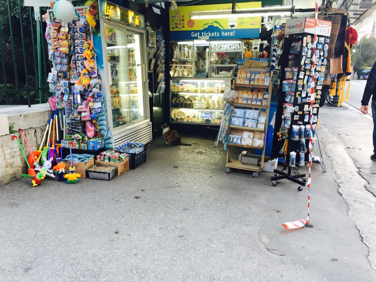 뚱보고양이를 찍어주고 잠시 정원을 둘러본 뒤 다시 셔틀버스 정류장에 왔더니 아까봤던 뚱보고양이가 길거리 좌판 앞에서 음료수를 탐내고 있다. 이쯤되면 운명의 데스티니(?)인가 싶어 재차 확인해봤더니 역시 녀석이 맞았다. 음료수를 한참 보고 있다가 본인의 아지트인 냉장고 뒷쪽으로 훌쩍 넘어 들어갔다. 그 모습이 귀엽기도 하고 재미있기도 해서 재빨리 사진기를 찾아 찍었다. 아테네에서 인상적인 것들이 많았지만 이 장면은 참을 수 없는 귀여움으로 기억되었다.