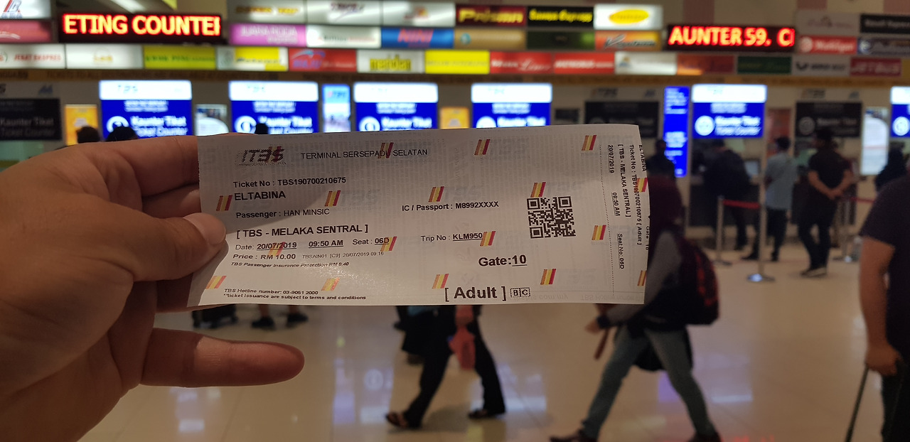 TBS터미널에서 말라카까지 가는 버스 티켓이다.