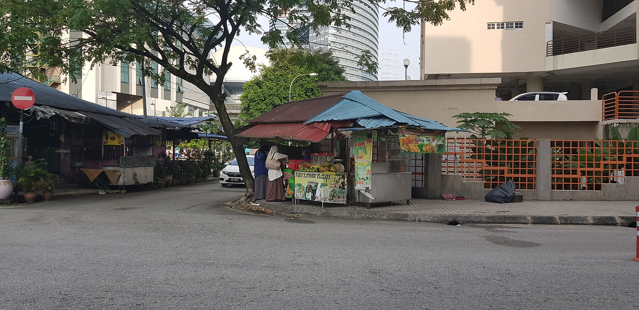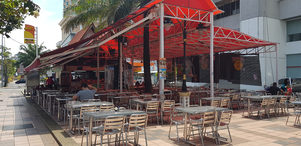 말라카 중심지에 거의 접어들 무렵, 은행들이 줄지어 선 대로변에 있는 야외형 식당을 만났다.