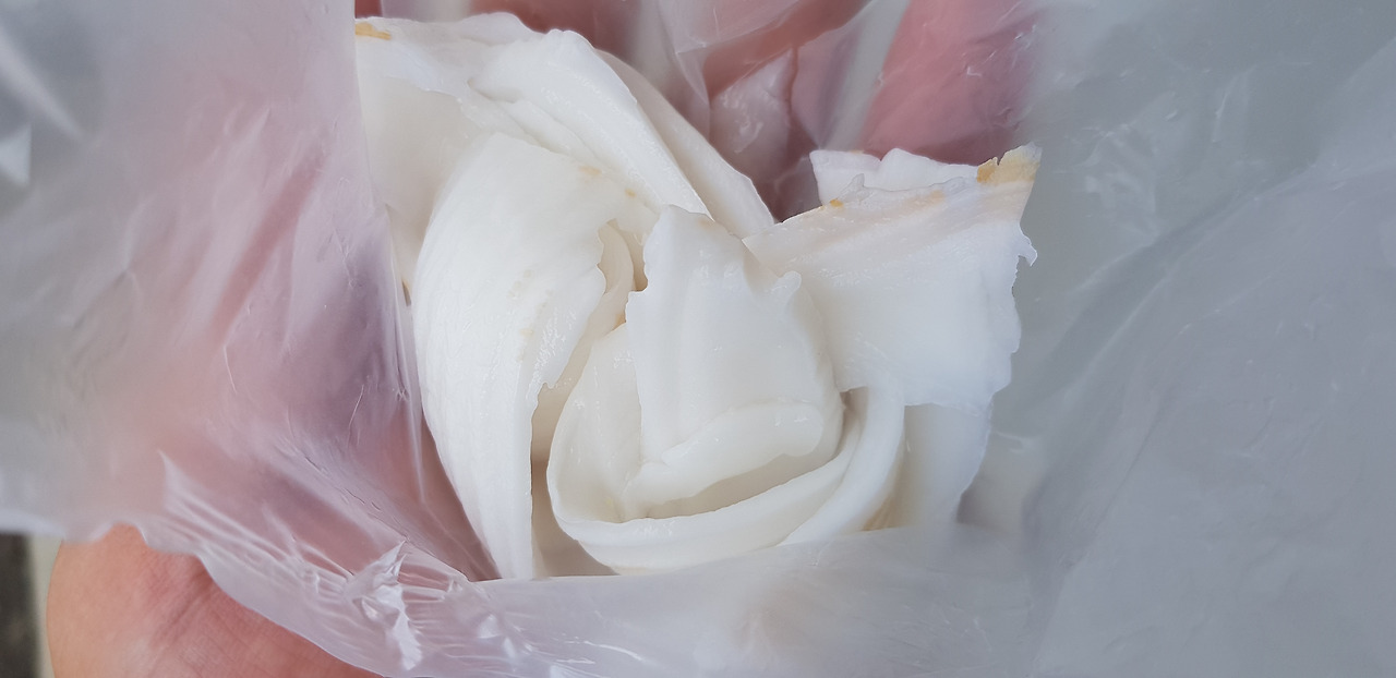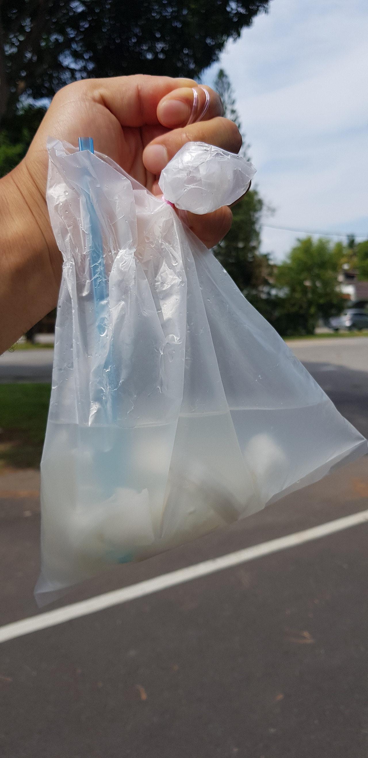 그는 옆 아이스박스를 열더니 불투명한 코코넛 과즙이 담긴 비닐봉지 하나를 꺼내 얇은 비닐끈으로 매듭을 시작했다.