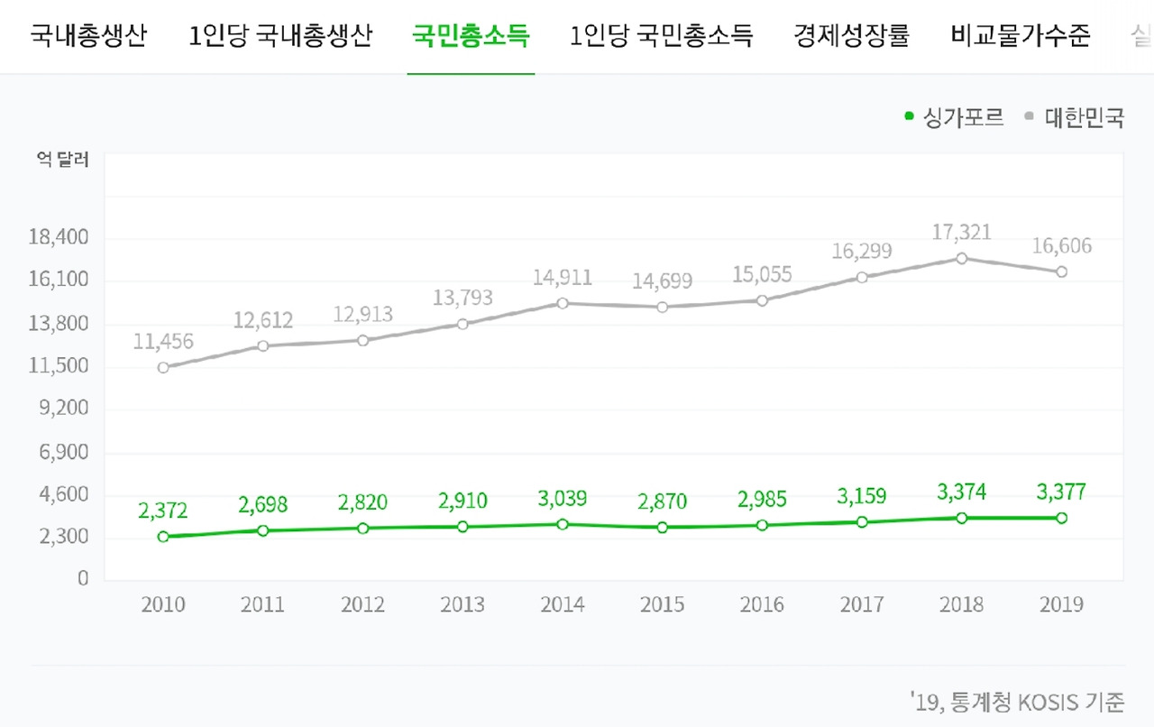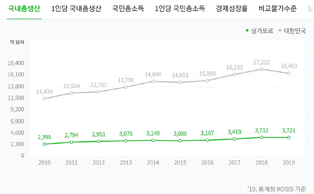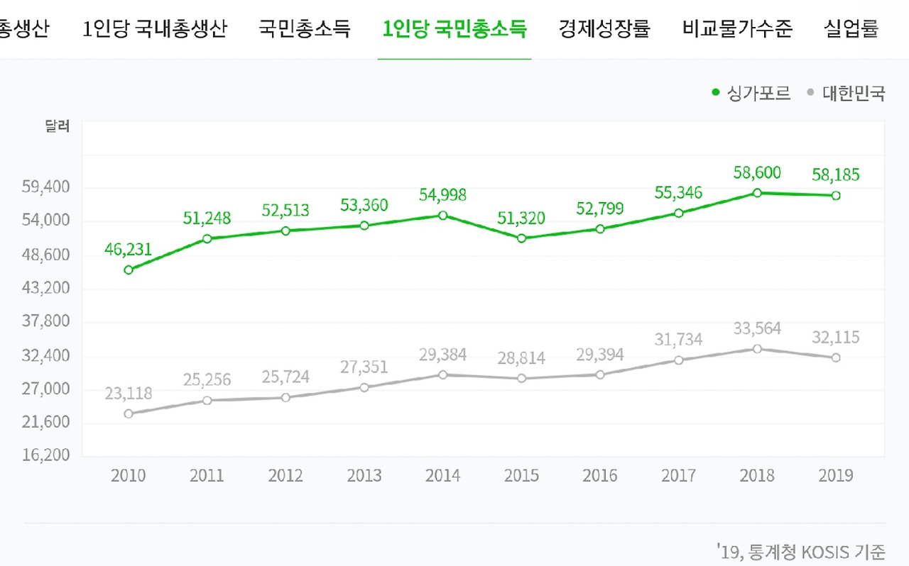 싱가포르의 1인당 국민총생산은 대한민국의 2배가 넘으며 1인당 국민총소득은 거의 2배에 육박한다. 다행히 아무리 어마 무지한 통계청이라 할 지라도 이런 수치를 조작할 순 없을 거라 생각하고 믿고 넘어가기로 한다.
