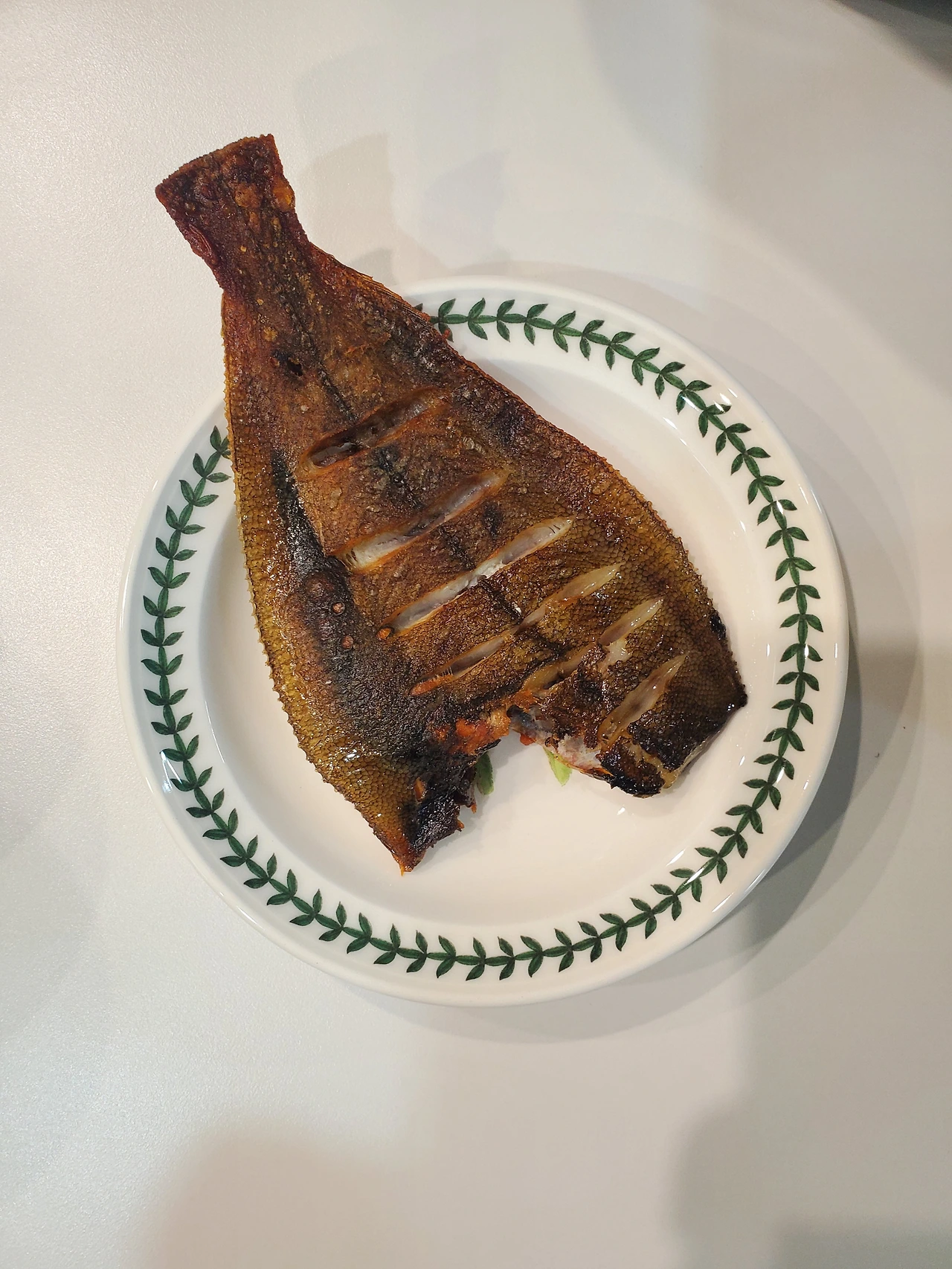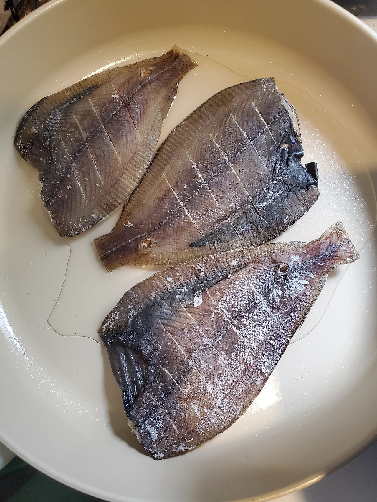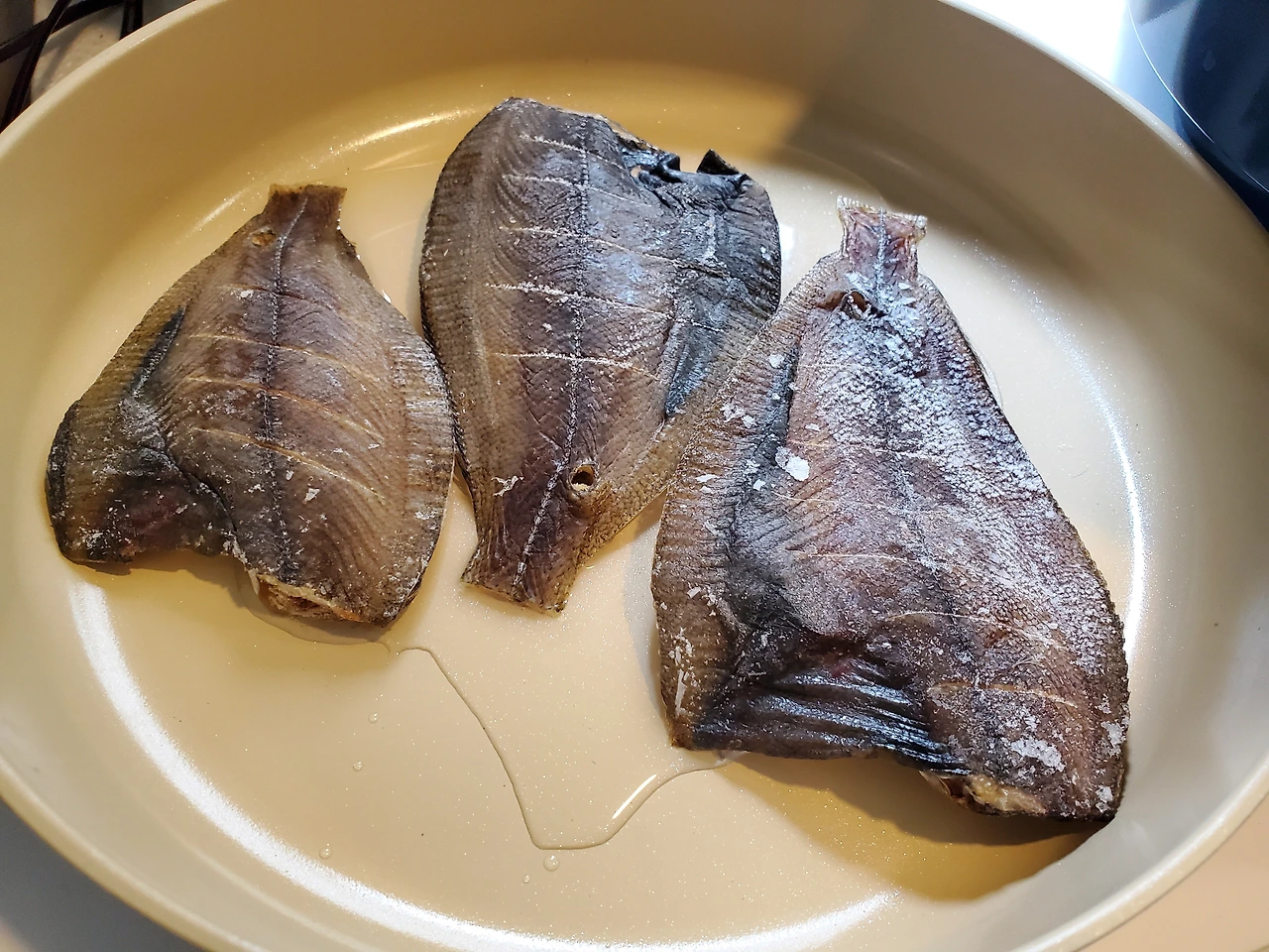 프라이팬에 기름을 왕창 두르고 드디어 기다리고 기다리던 가자미를 굽기 시작했다. 이 맛을 며칠이나 기다렸다고~ 반 정도만 건조된 가자미는 수분이 많아 기름이 많이 튄다. 프라이팬용 뚜껑이 없어 냄비 뚜껑을 덮어 앞뒤로 노랗게 구웠다. 간자미를 제대로 익히면 지느러미 부분의 뼈는 씹어 먹어도 좋다. 얼마나 맛있는지 모른다.