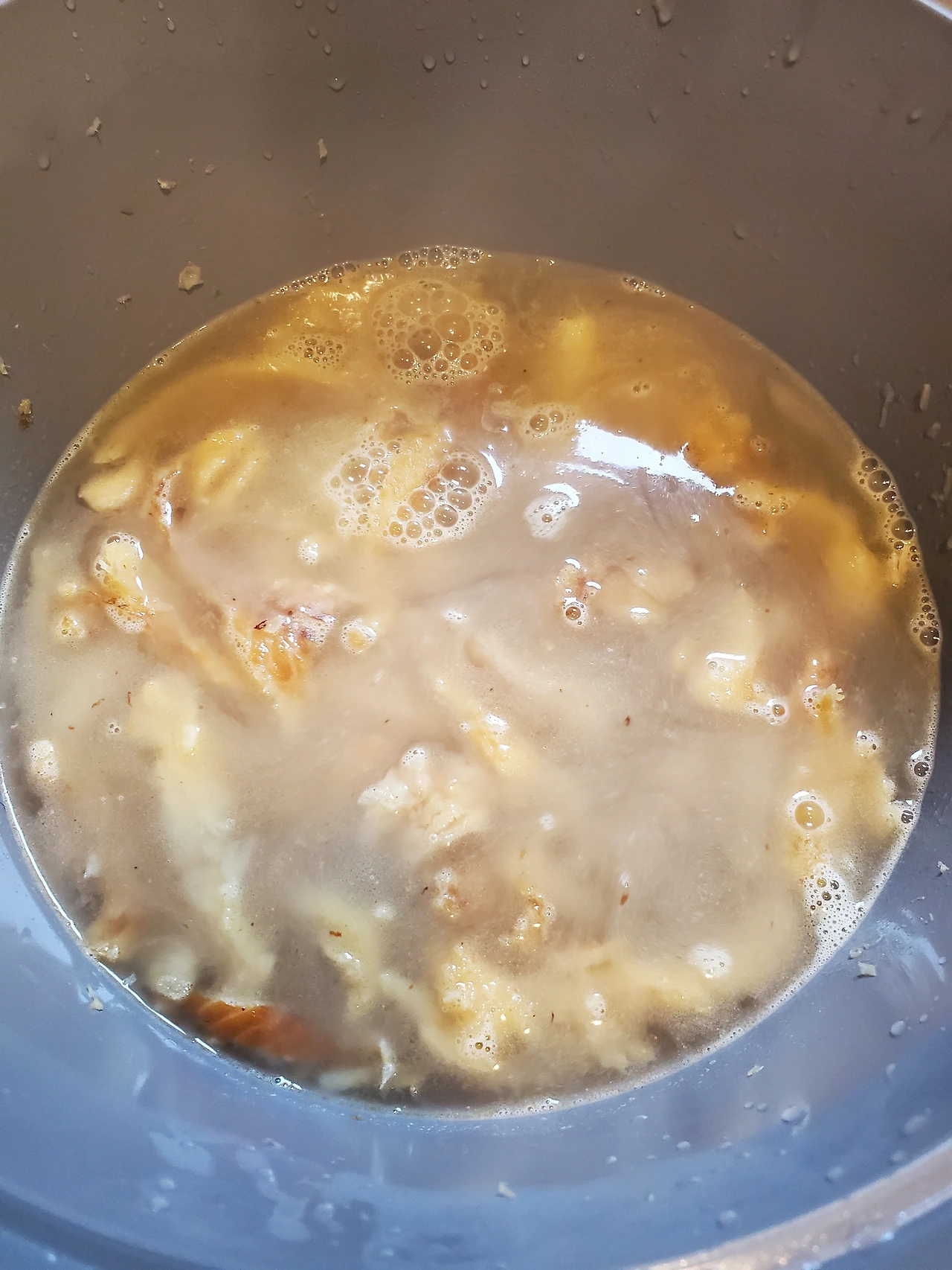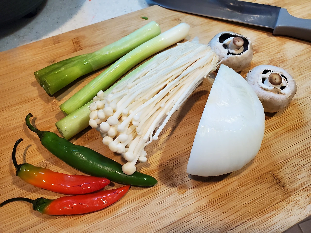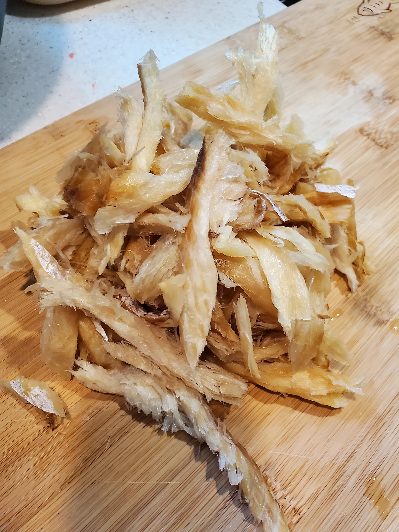 황태 살과 한 몸이 됐다 분리 작업이 시작되면 뽀얀 국물이 먹음직스러워진다. 이제부터가 제대로 요리를 시작할 때다. 다진 마늘을 한 숟가락 듬뿍 투척한다. 한국인에겐 역시 마늘 아닌가! 청양고추, 홍고추, 팽이버섯, 금 같은 대파, 양송이버섯, 양파를 썰어 둔다. (양파는 넣지 말았어야 했다. 국물에서 단맛이 나서 황탯국 본연의 맛이 사라져 버렸다.)