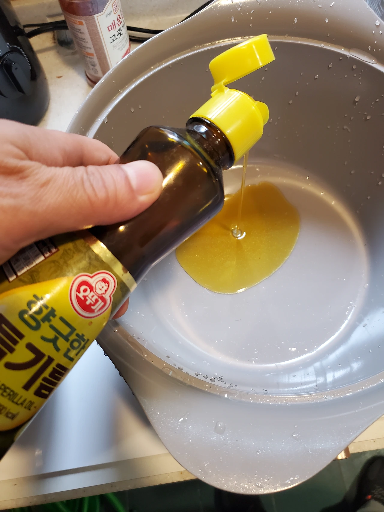 왠지 집에서 해 먹던 것과는 느낌이 많이 다른 것 같다. 우선 손으로 물기를 꽉 짜내어 대기시킨 후 냄비에 오뚜기 들기름을 들이부었다. 아끼면 안 된다. 황탯국의 고소한 맛을 담당하는 녀석이니까 말이다. 얼마나 잘 볶아내느냐가 황태의 깊은 맛을 끌어내는 포인트가 된다.