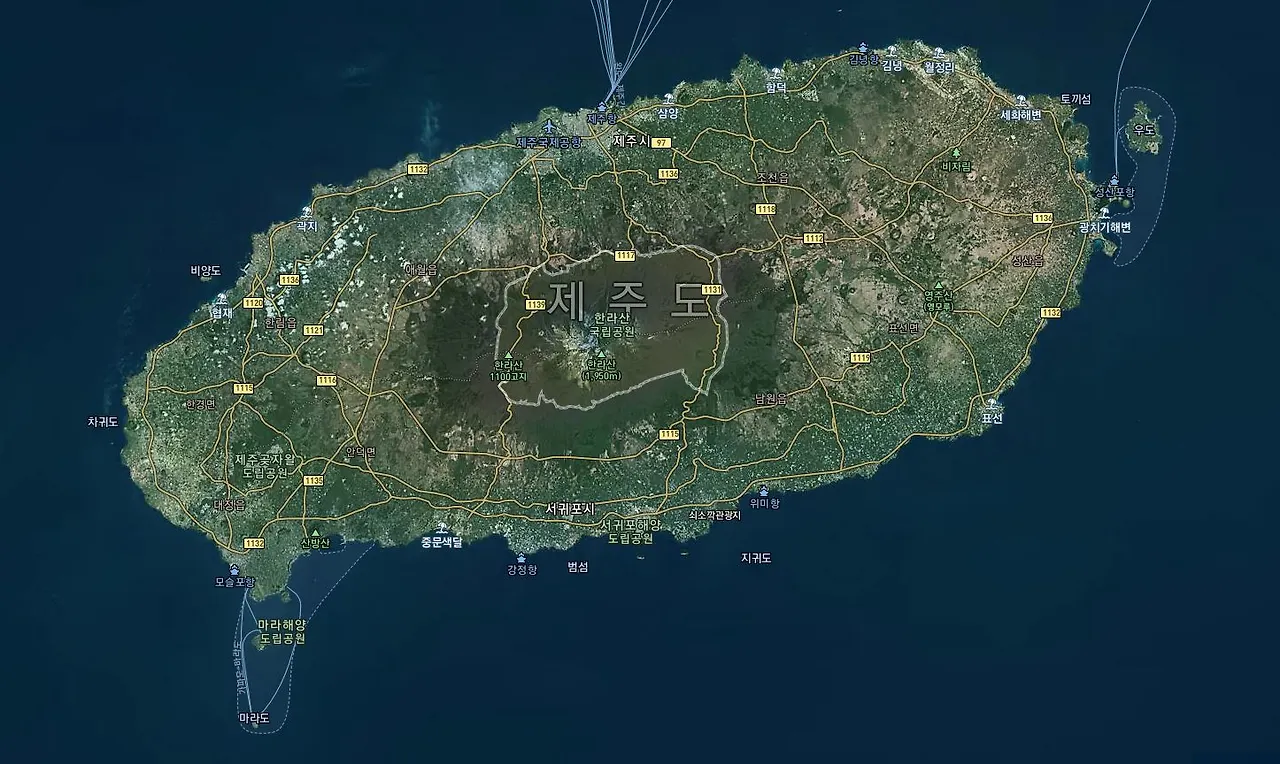 이렇게 놓고 잘 보면 제주도는 참 정말 묘한 구석이 있다. 한라산을 중심으로 정북 방향에 제주국제공항이 자리 잡고 있고 남쪽으로는 서귀포 구도심이 위치한다. 동쪽으로는 성산 일출봉이 있고 좌측으로는 제주도 서쪽 끝이라고 할 수 있는 고산 차귀도 근처다. 방위 상으로는 약간의 오차가 있기는 하지만 일부러 이렇게 조성한 것만 같다.